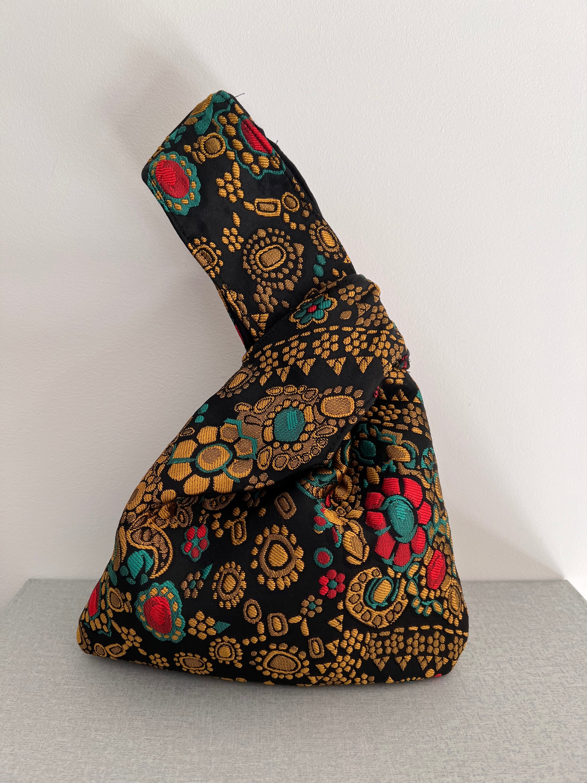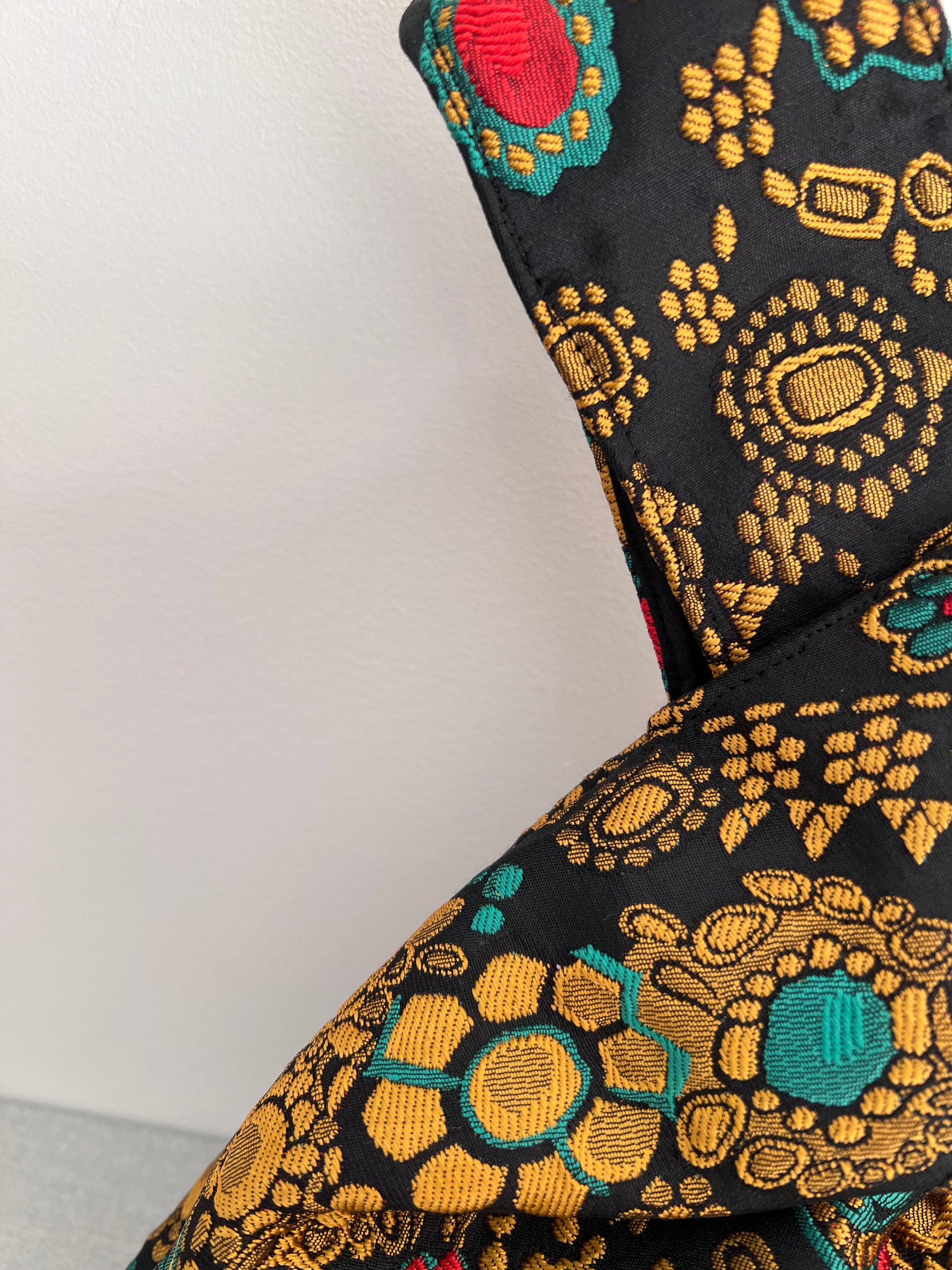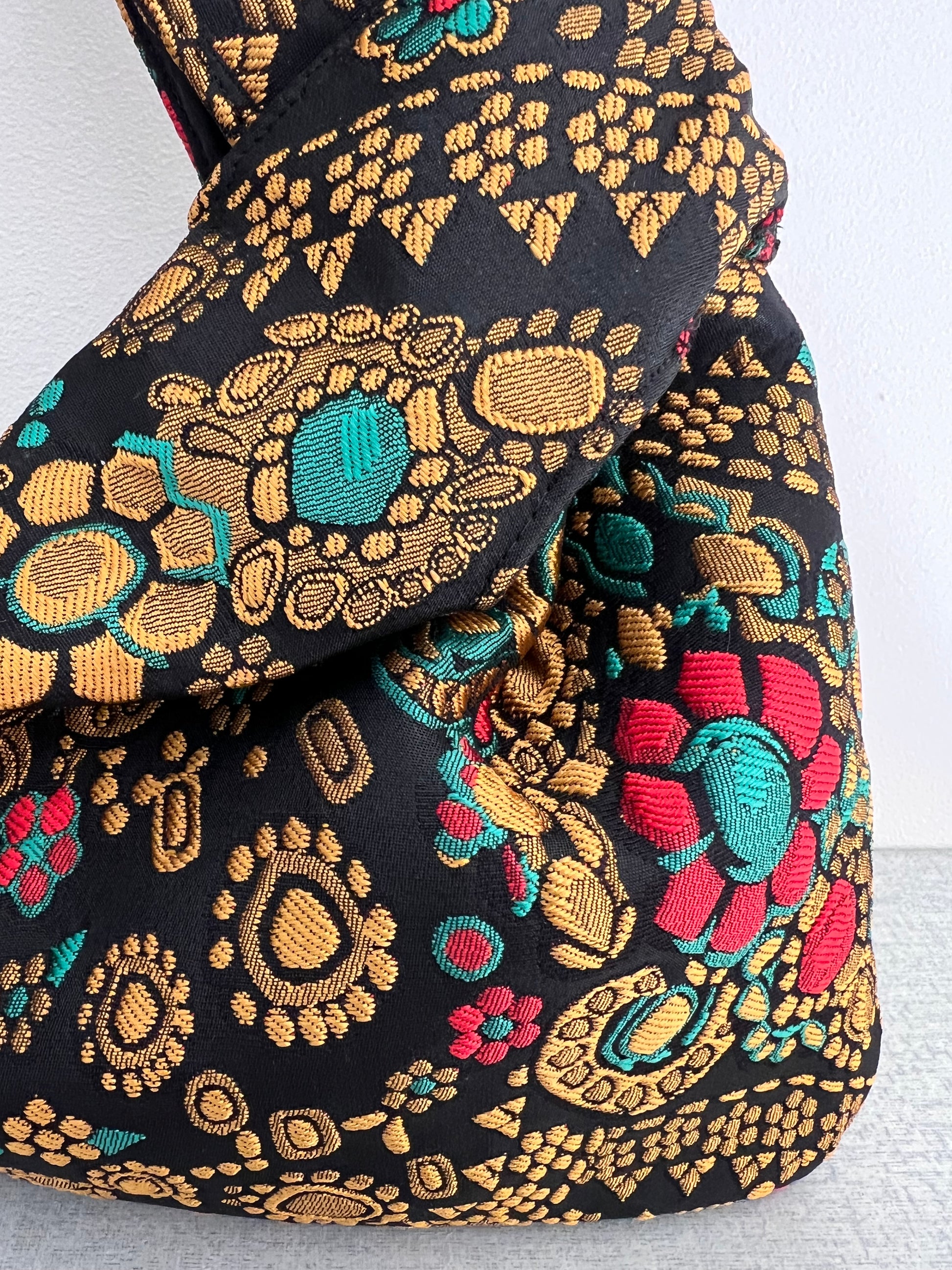 Modelo Alegra en tela tipo brocado con fondo negro y bordados en varios colores, dorado, rojo, turquesa, verde.