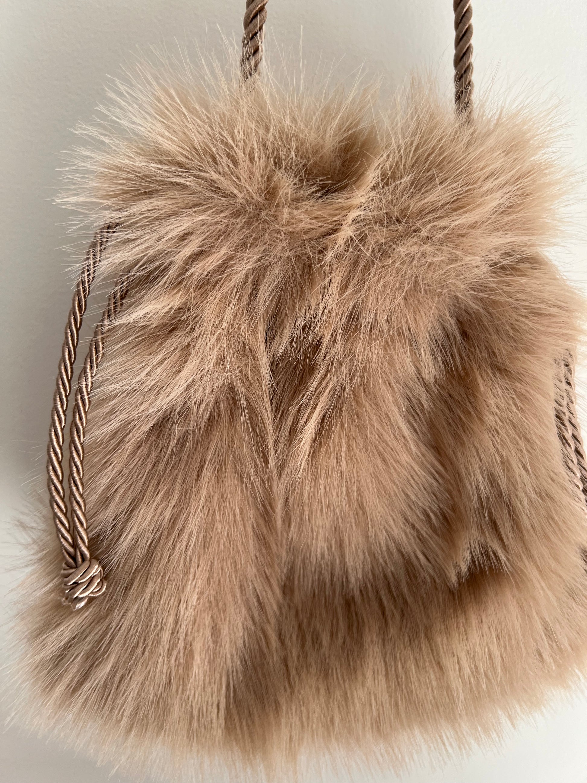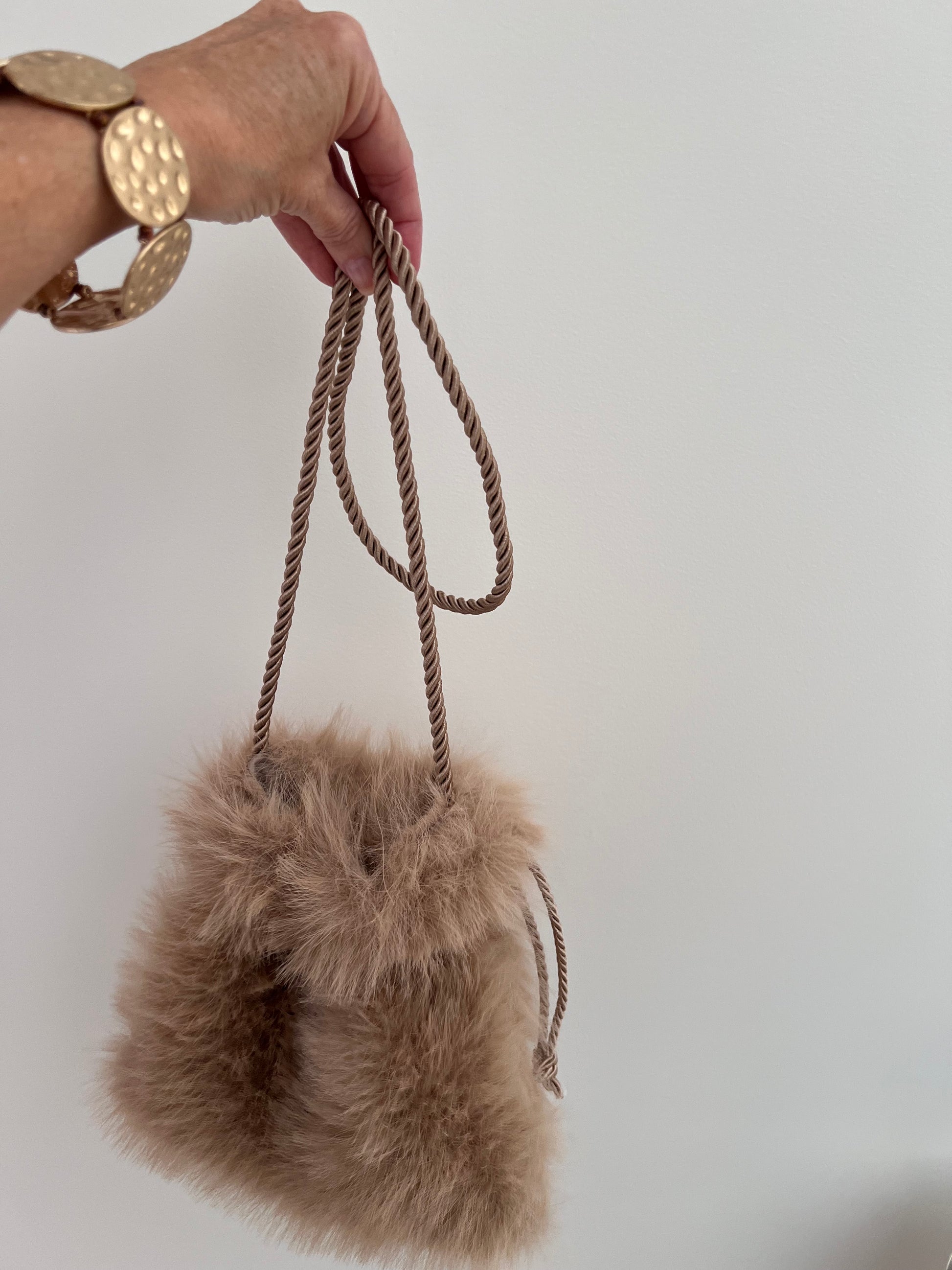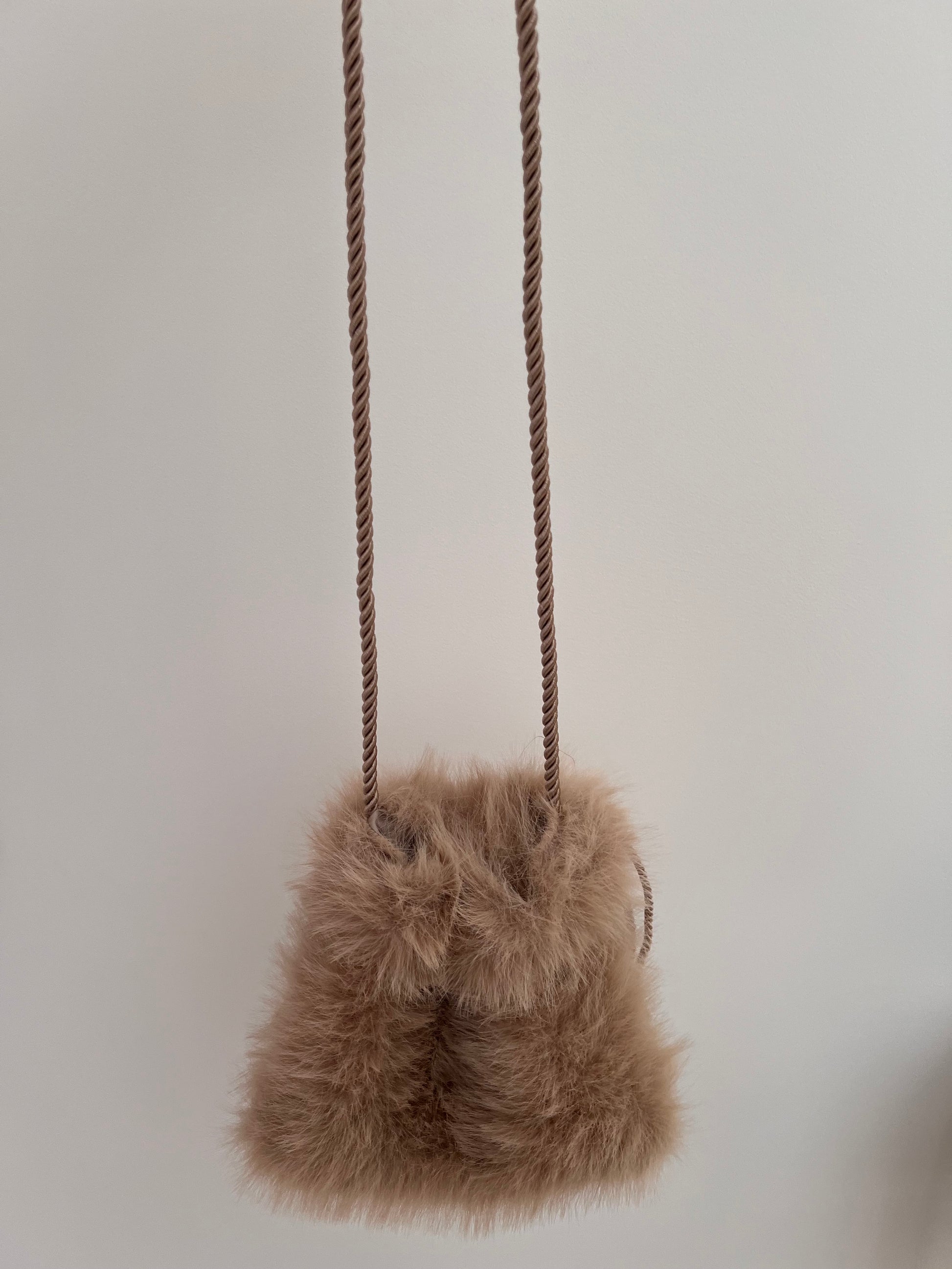 Modelo Aurora, de tacto suave tipo pelo en tono beige cálido. Con cierre fruncido mediante doble cordón y asa larga de cordón trenzado a juego. De aspecto ligero y textura agradable, ideal para llevar cruzado o al hombro.
