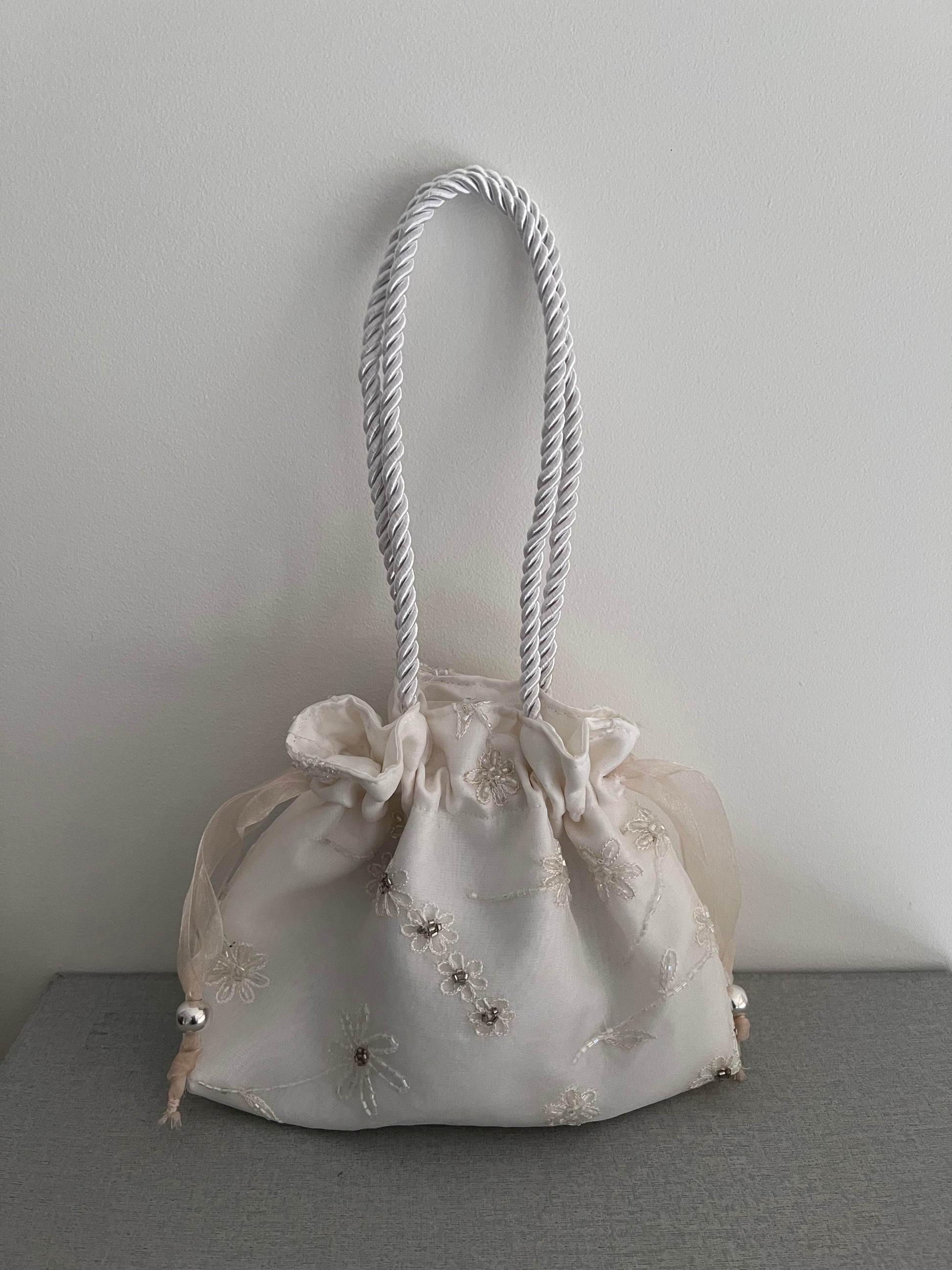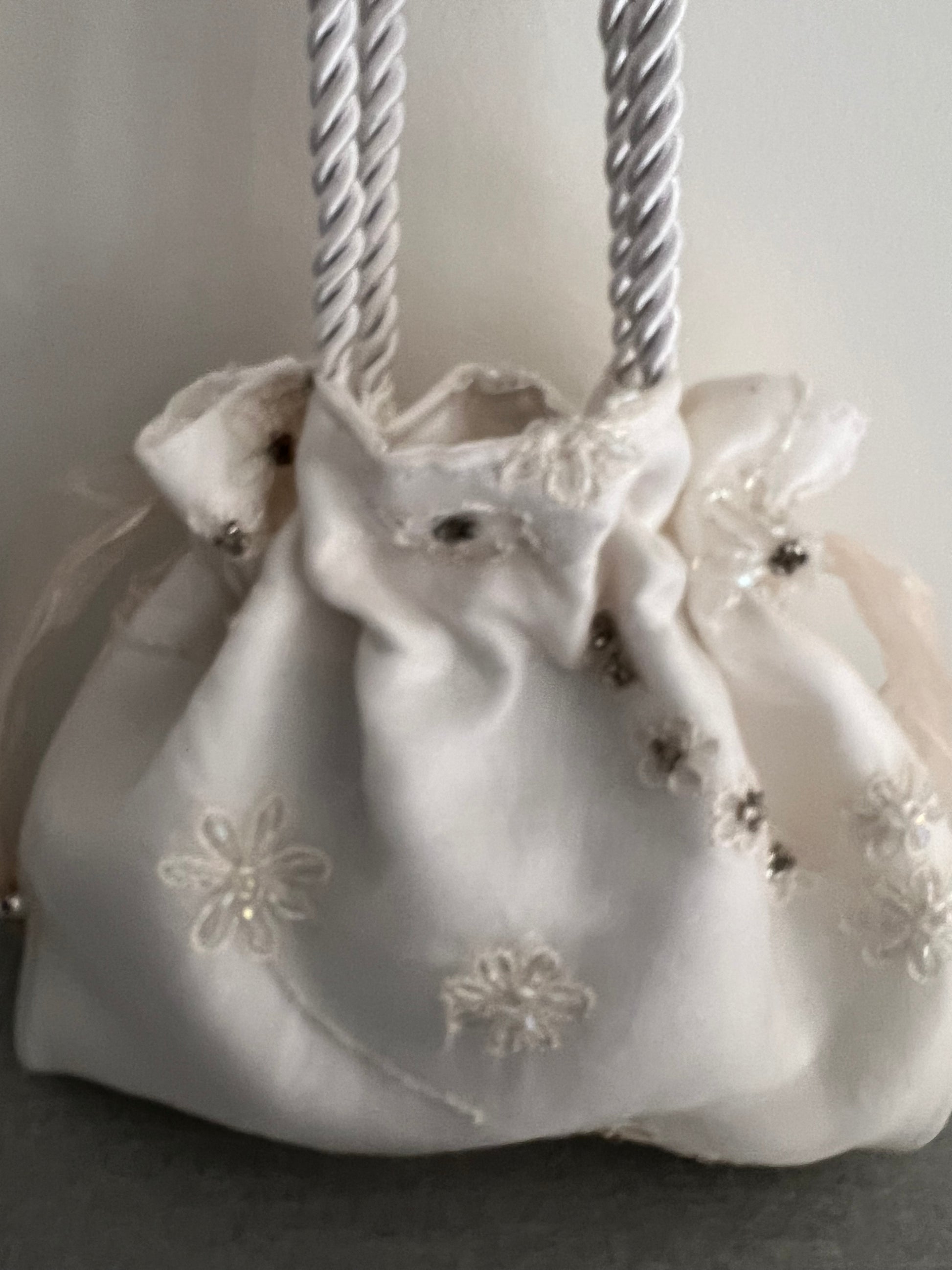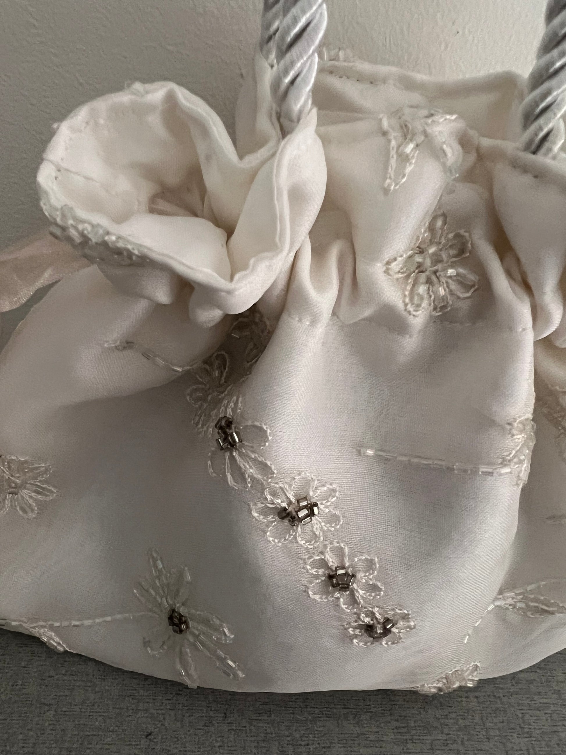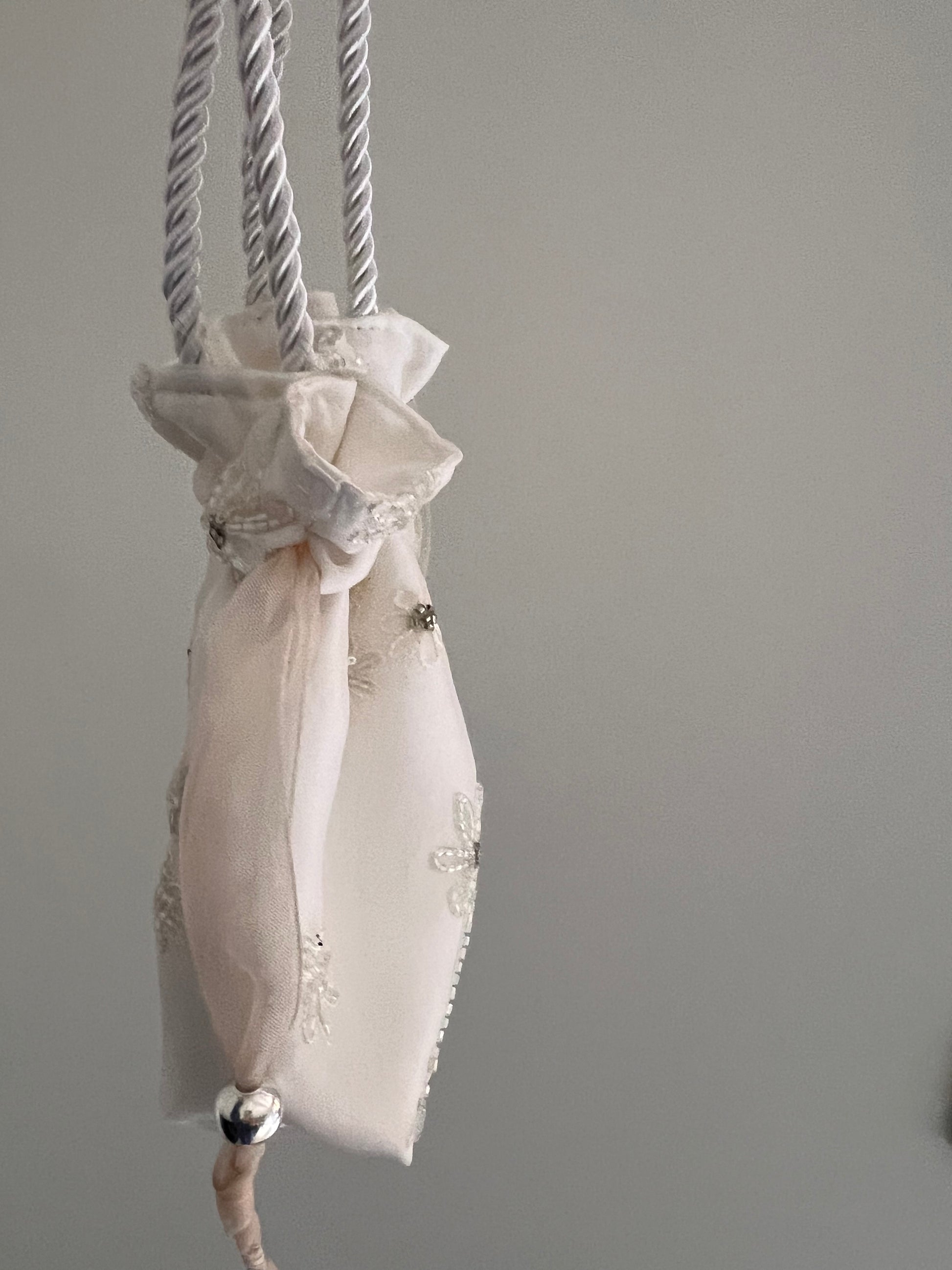 Modelo bombonera mini en tela de organza blanco roto con bordado en pedrería y flores, con dos asas de cordón satinado en tono marfil.