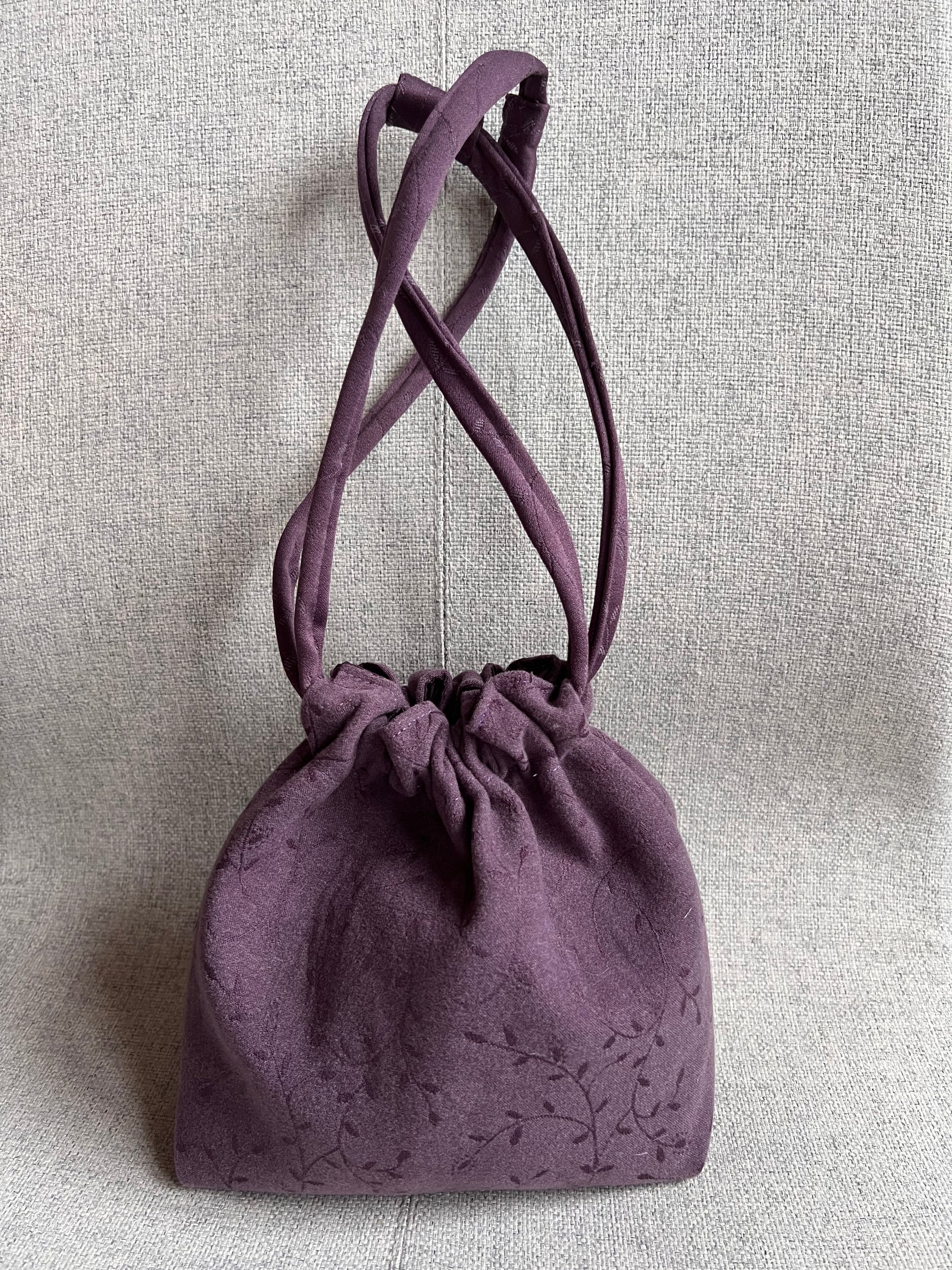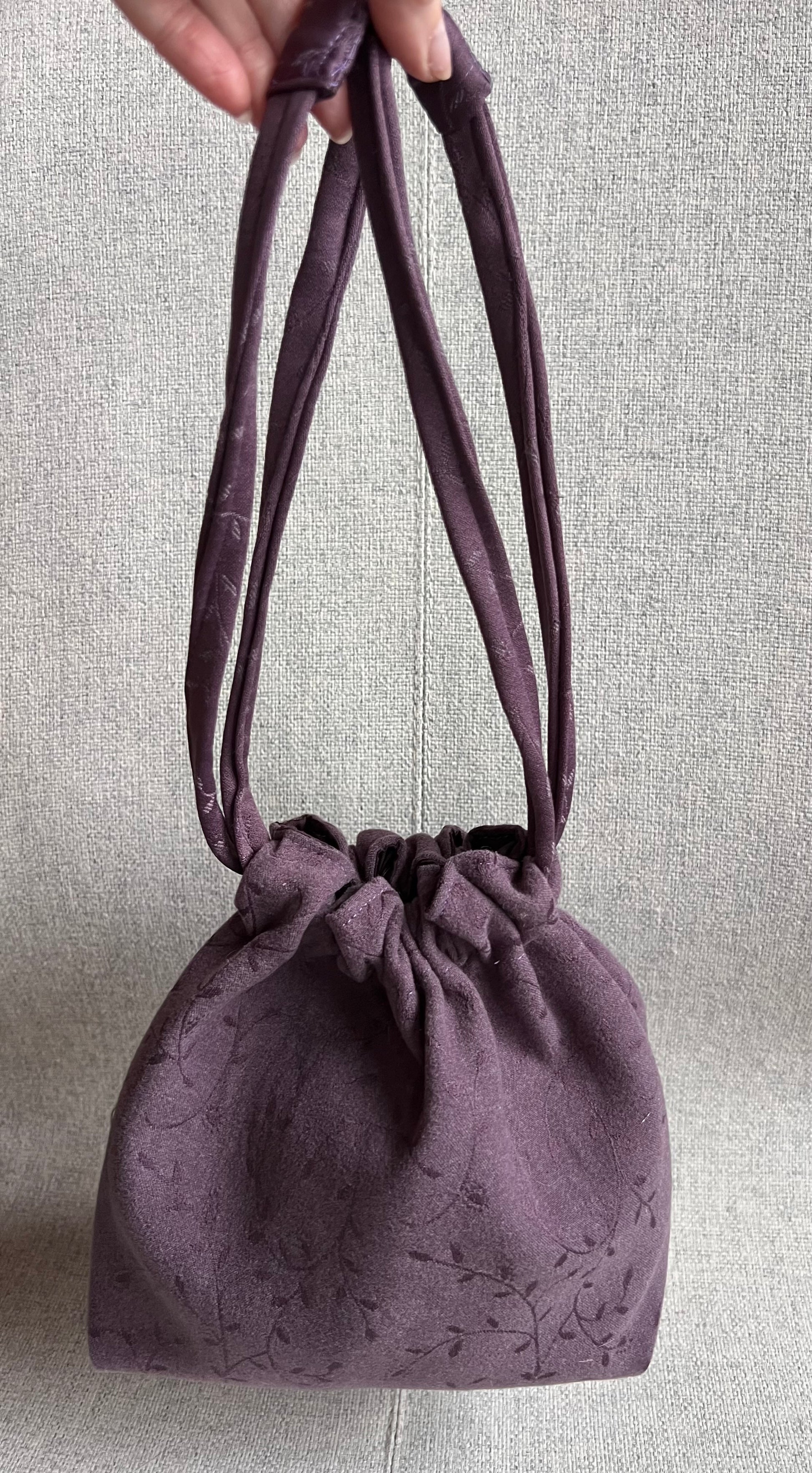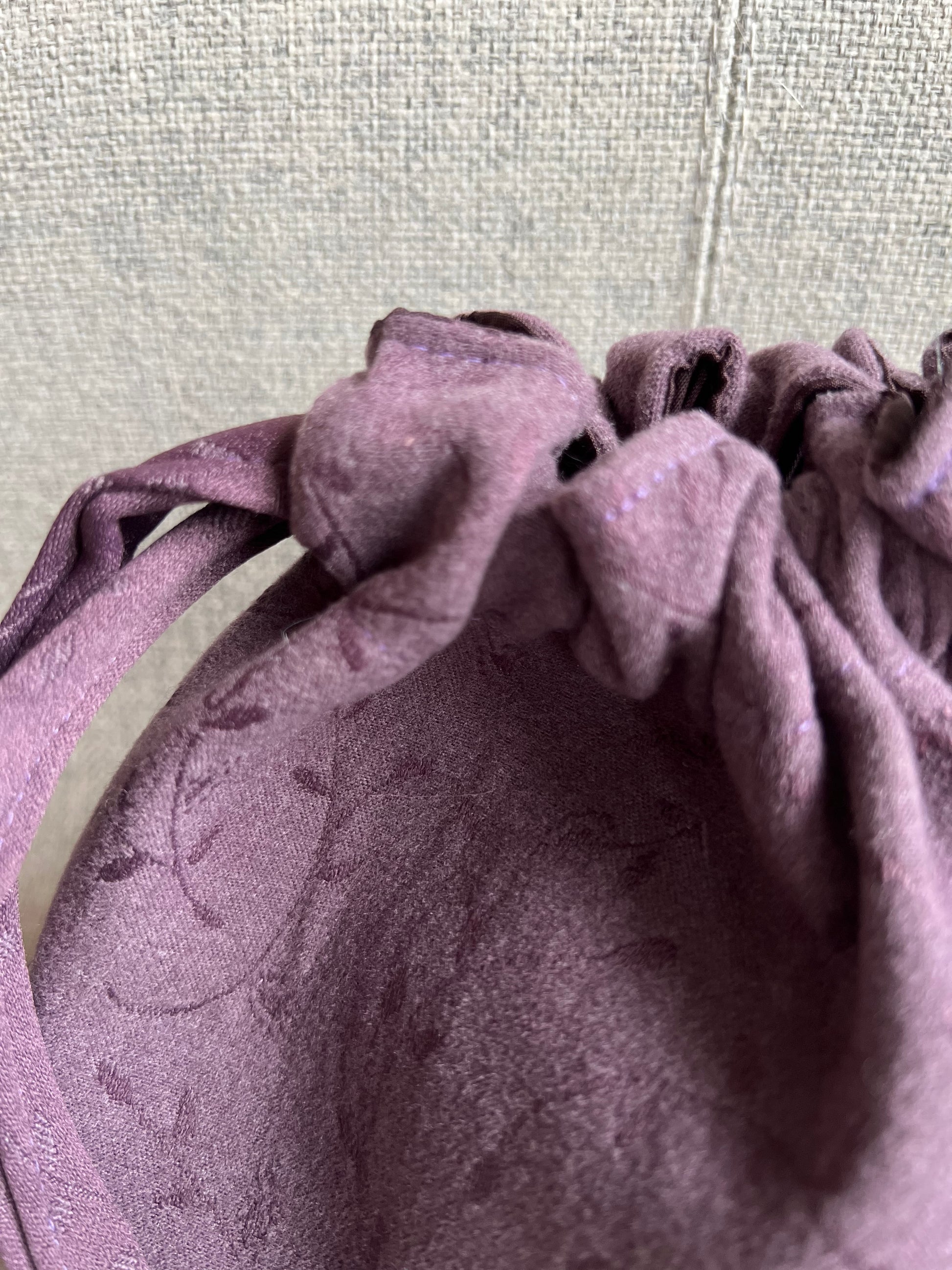 Modelo Bombonera Mini en tono ciruela con textura aterciopelada y ligero estampado floral, tiene 2 asas del mismo color de la tela que a su vez hacen de cierre del bolso.