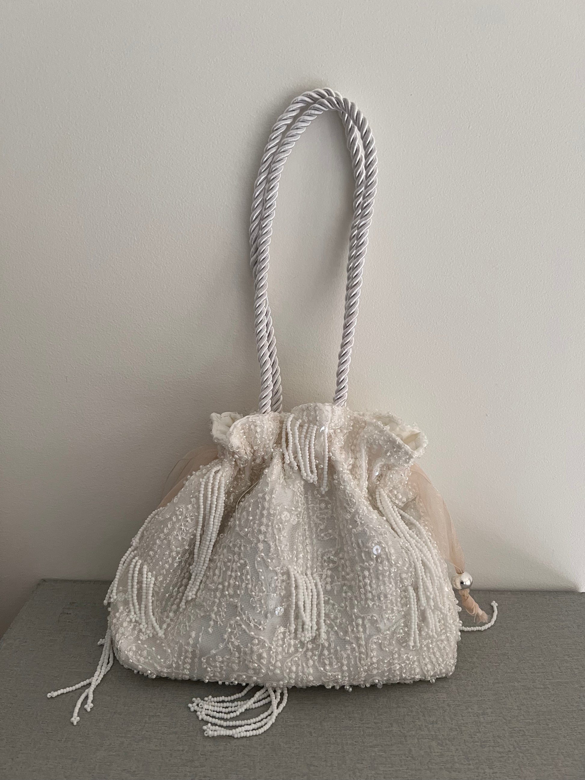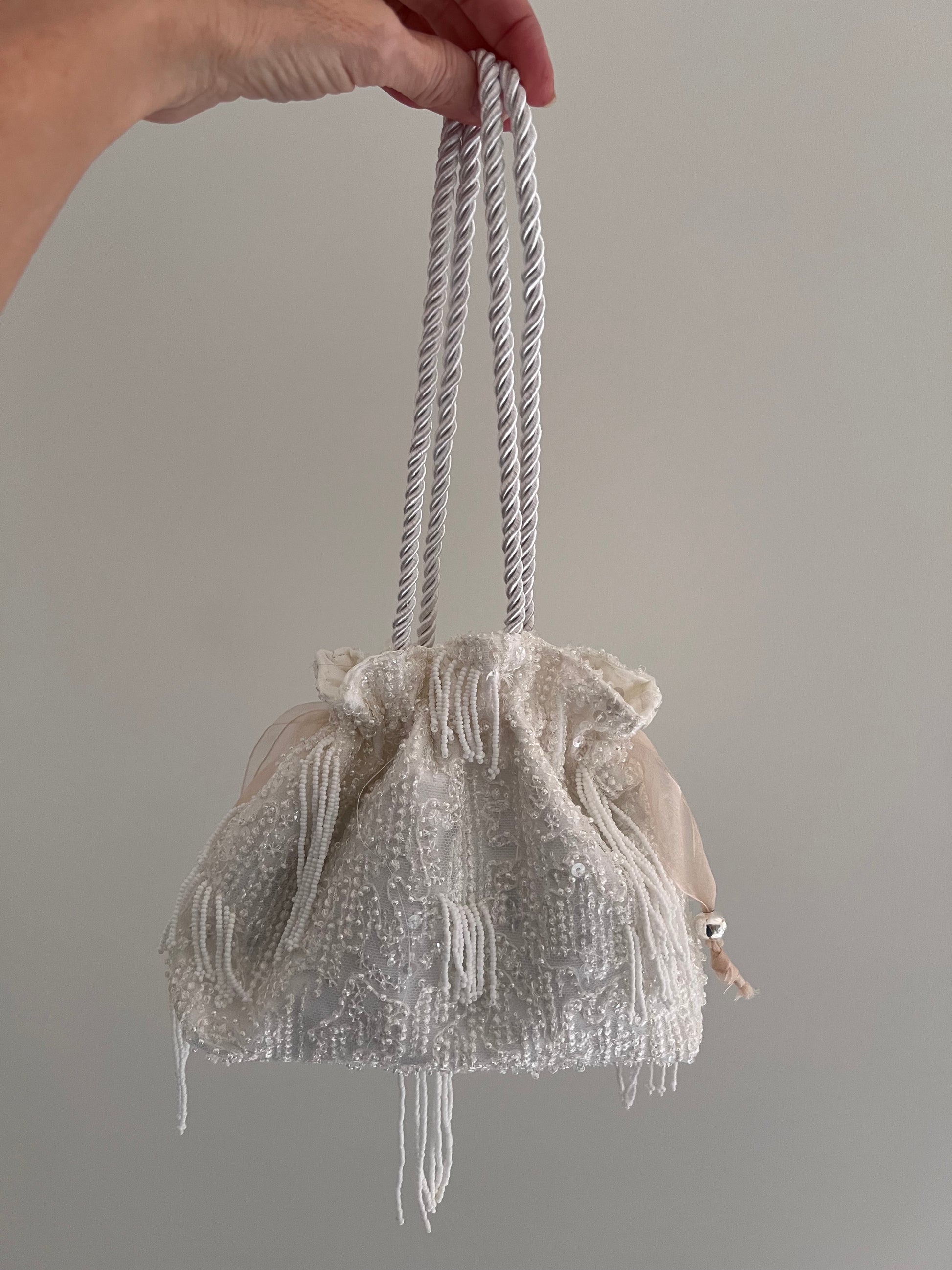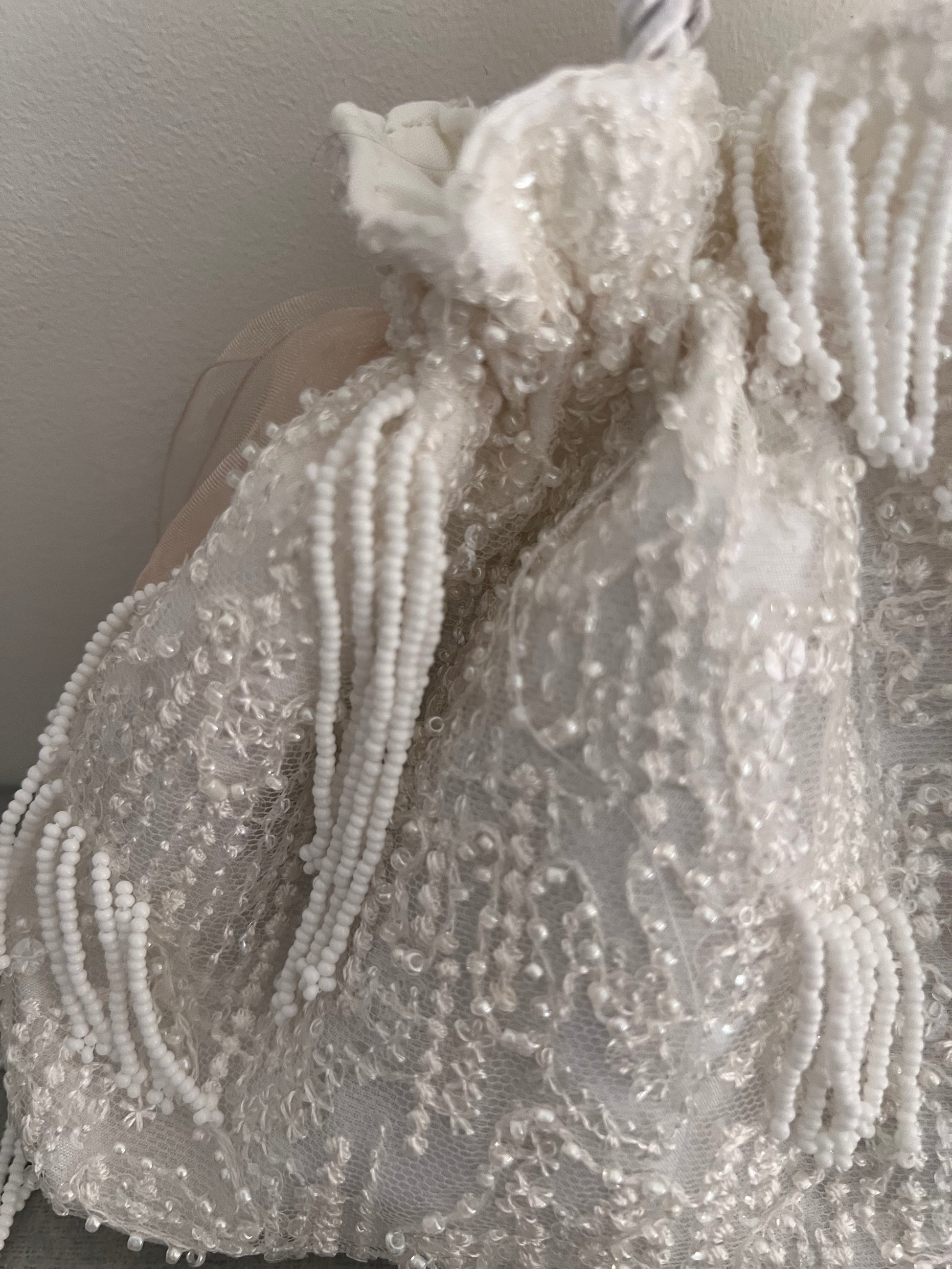 Modelo bombonera mini en tela de pedrería y abalorios en relieve sobre fondo blanco, con dos asas de cordón satinado en tono marfil.