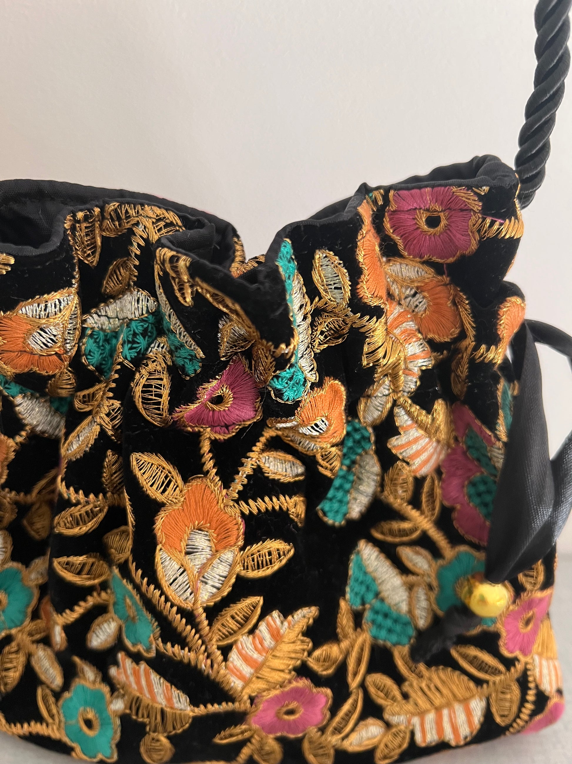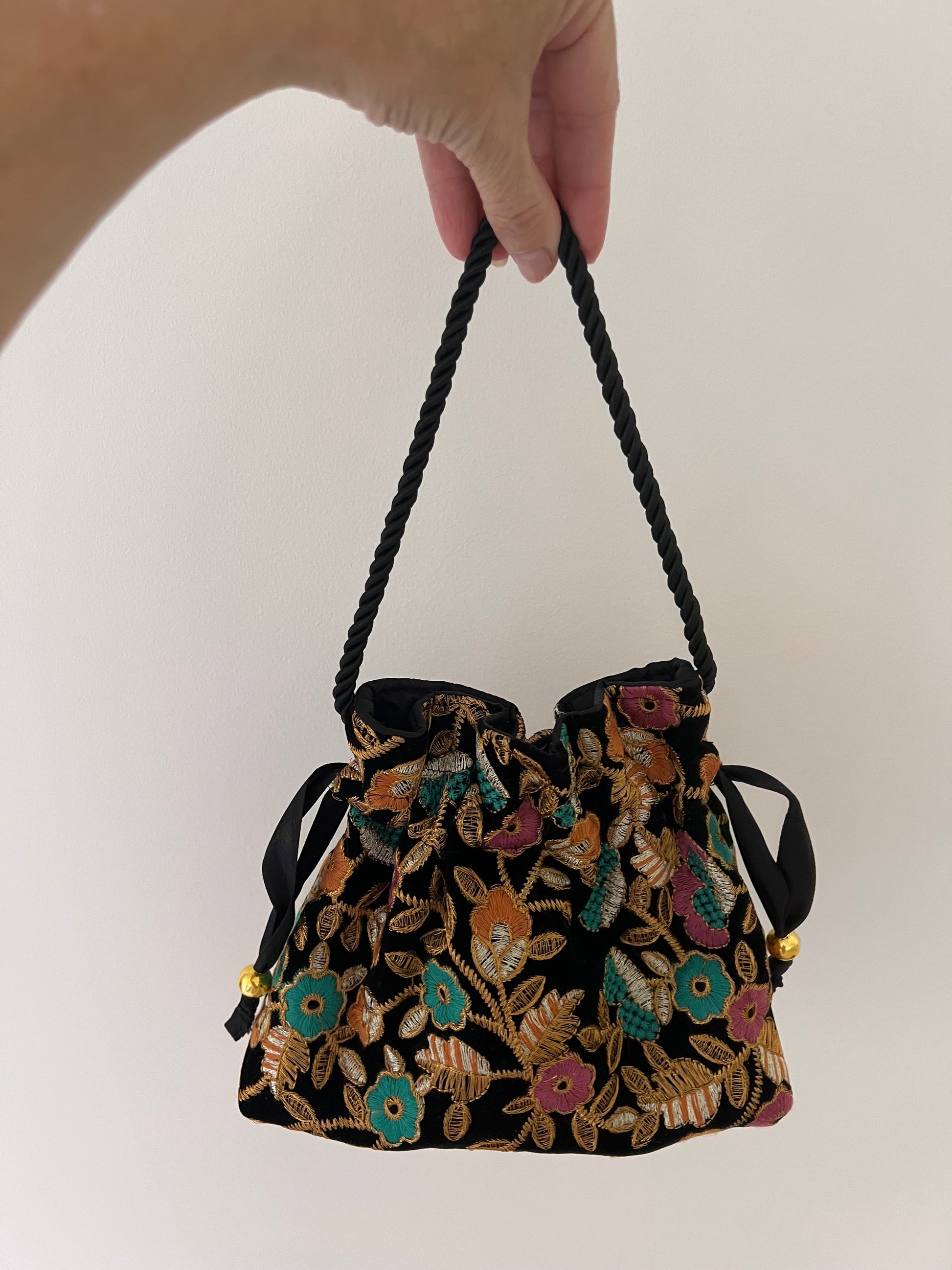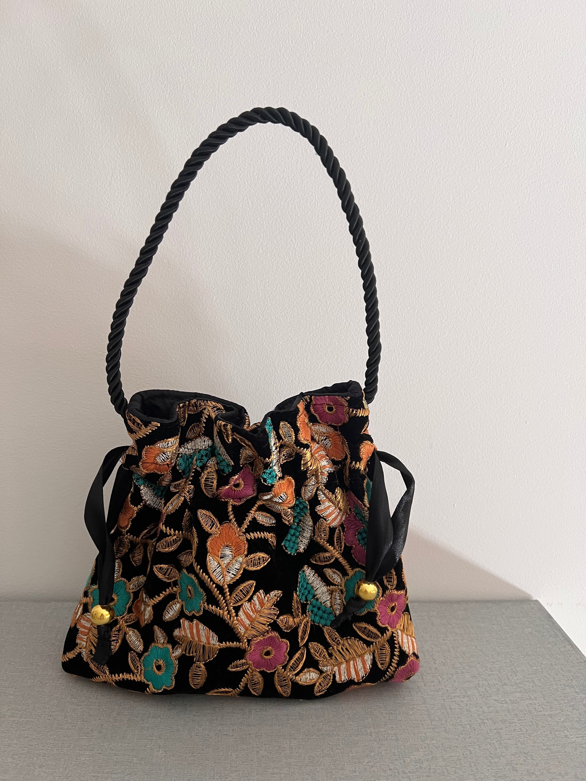 Modelo bombonera mini de antelina estampada de colores sobre fondo negro, tiene a modo de asa un cordón grueso negro.