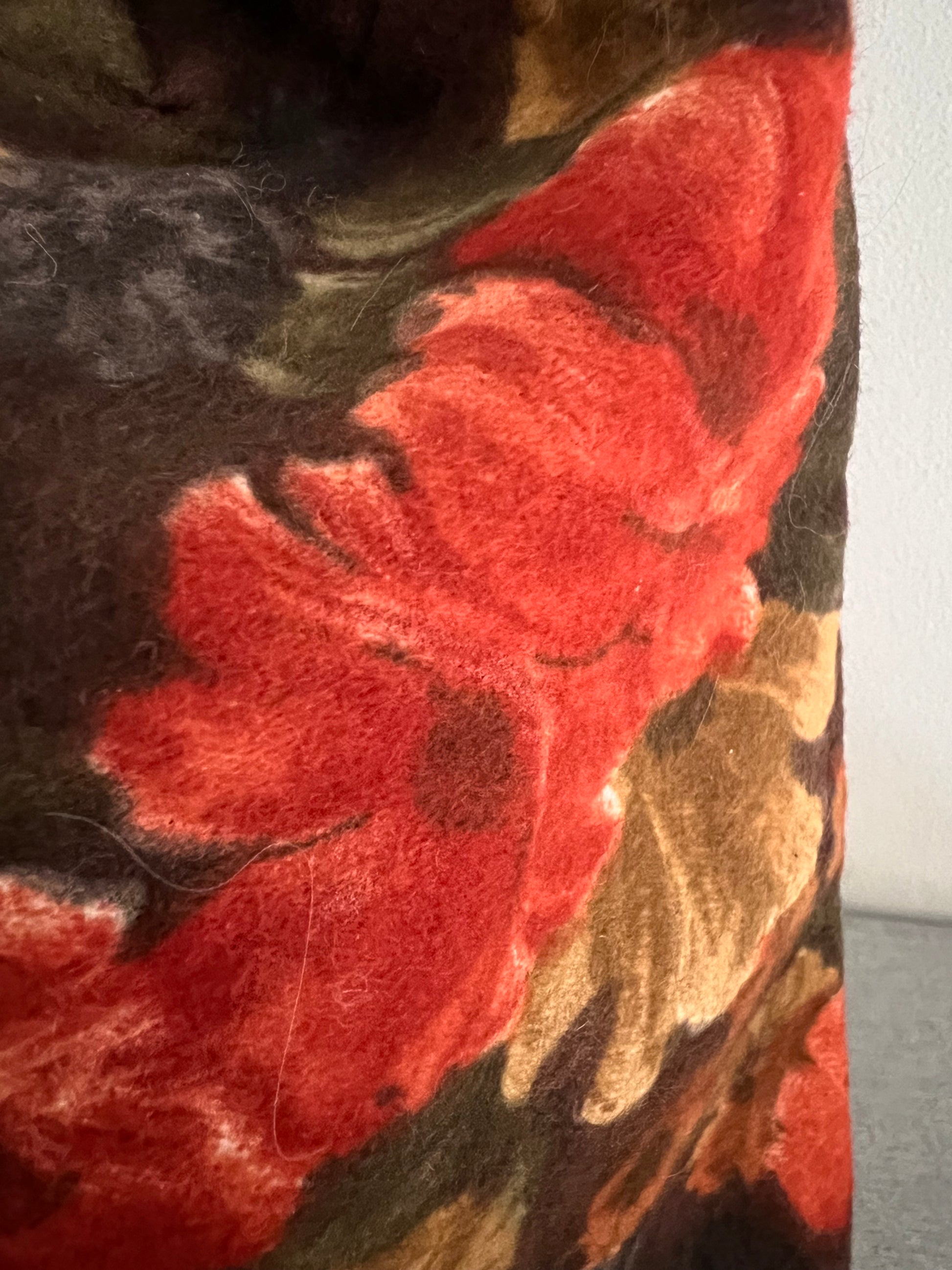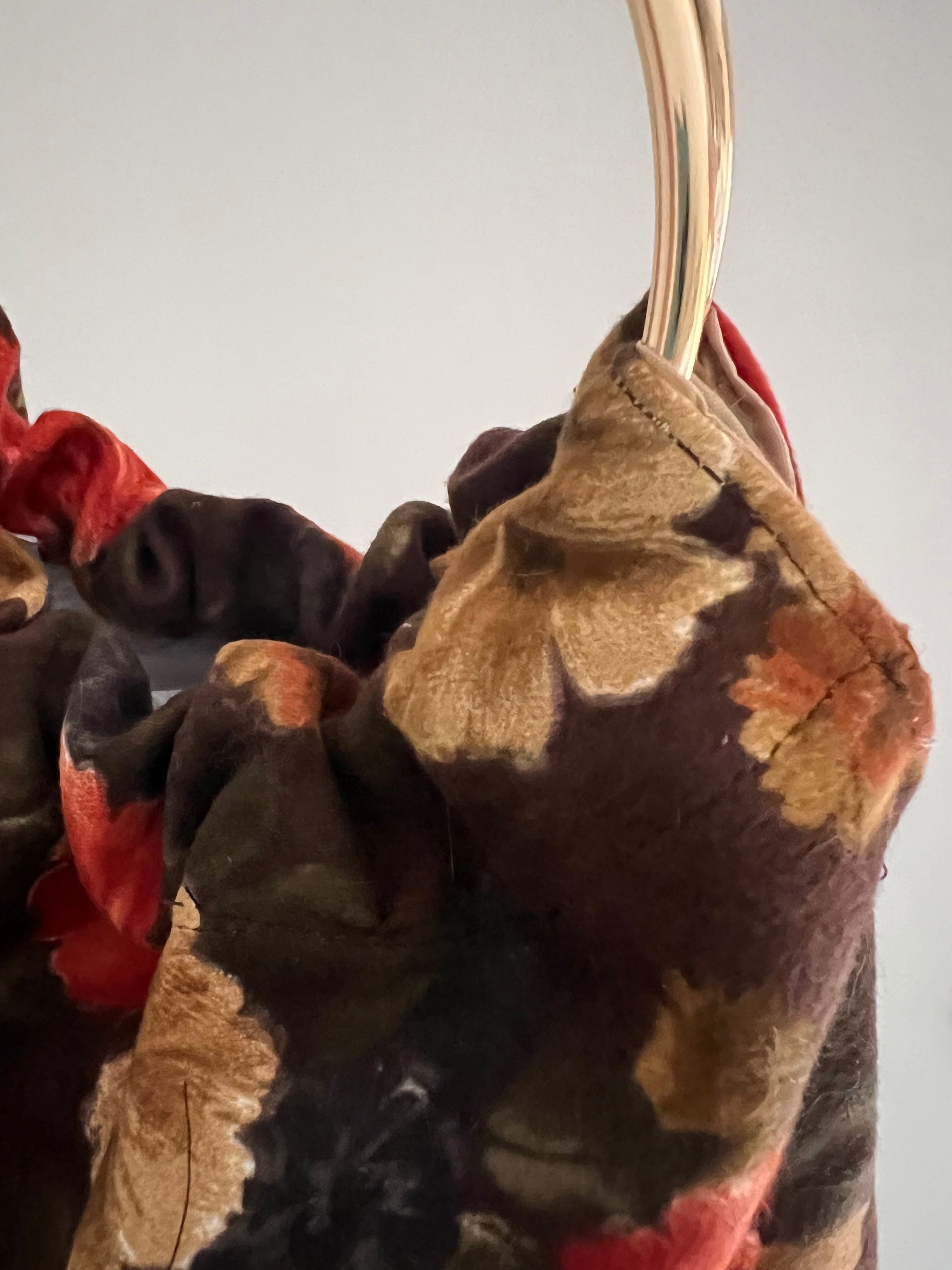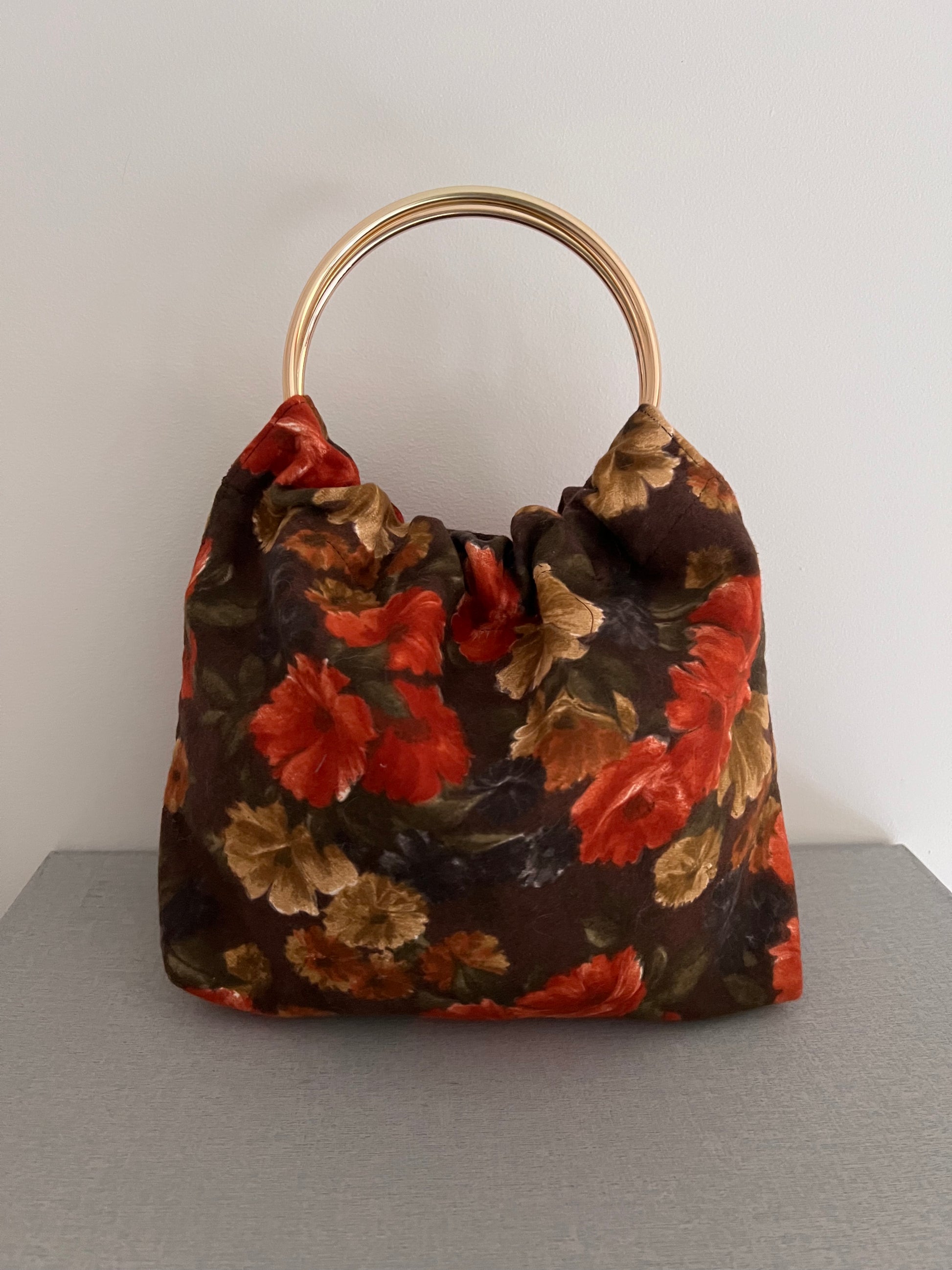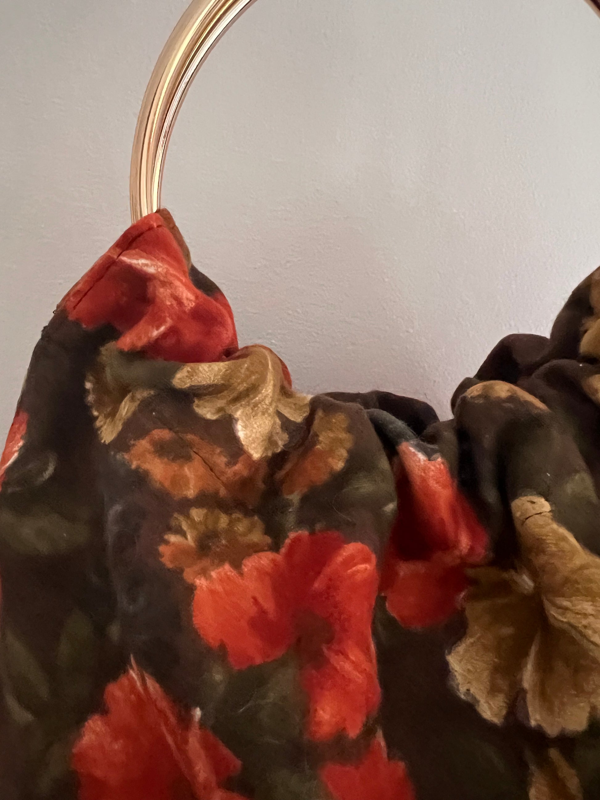 Modelo Gabino con textura suave y estampado floral en tonos cálidos que evocan el otoño. Su tejido tiene un ligero efecto aterciopelado que aporta profundidad y un aire vintage, sin ser terciopelo, tiene 2 asas doradas.