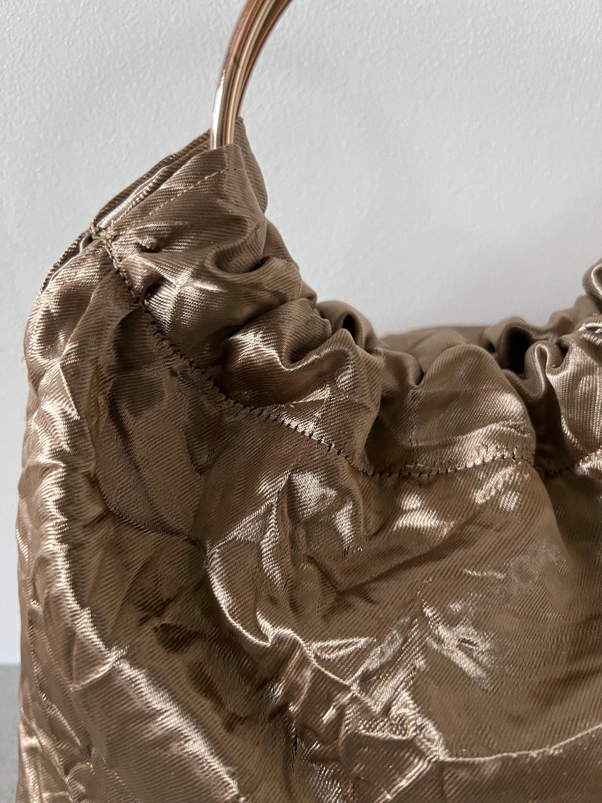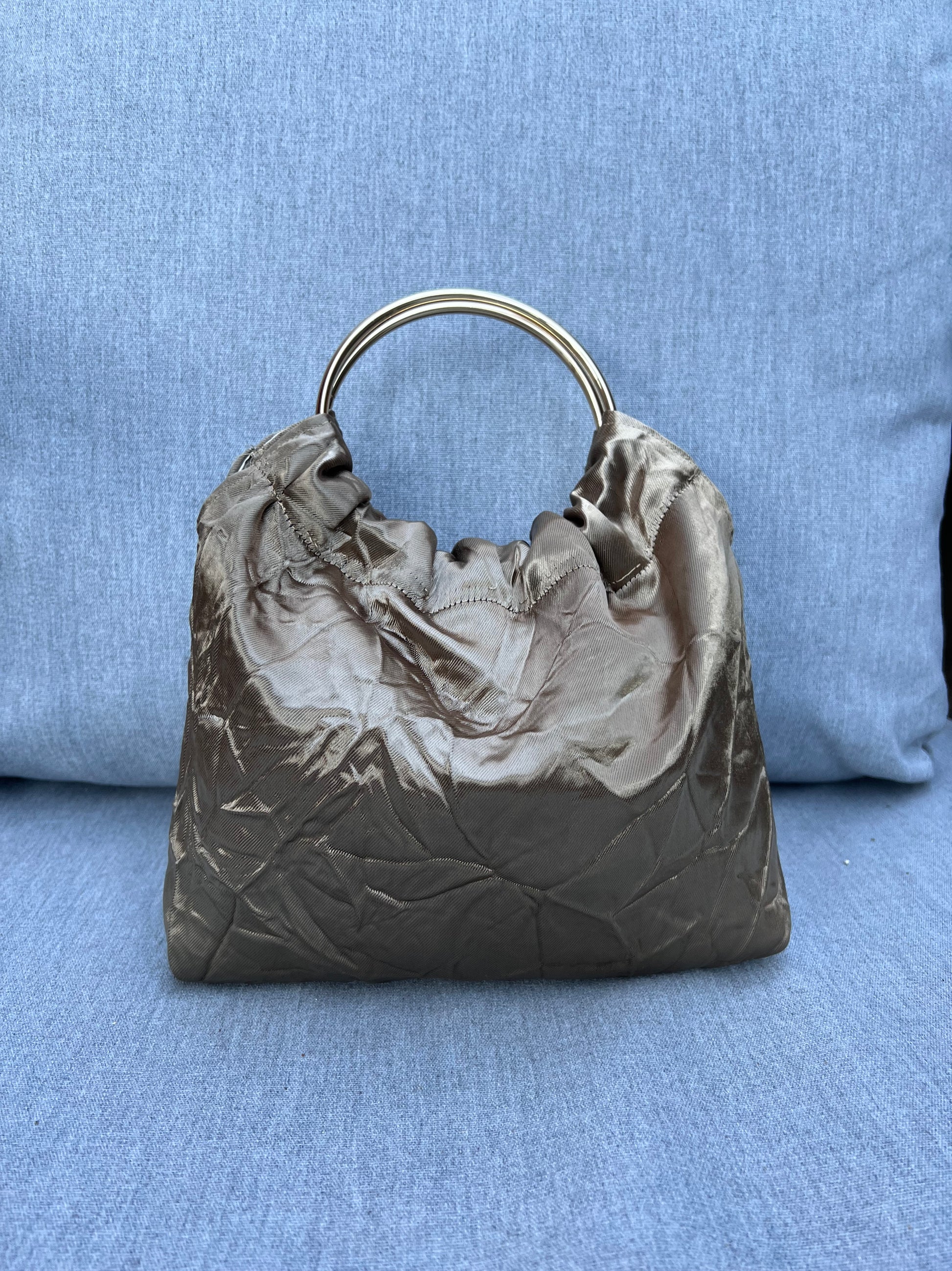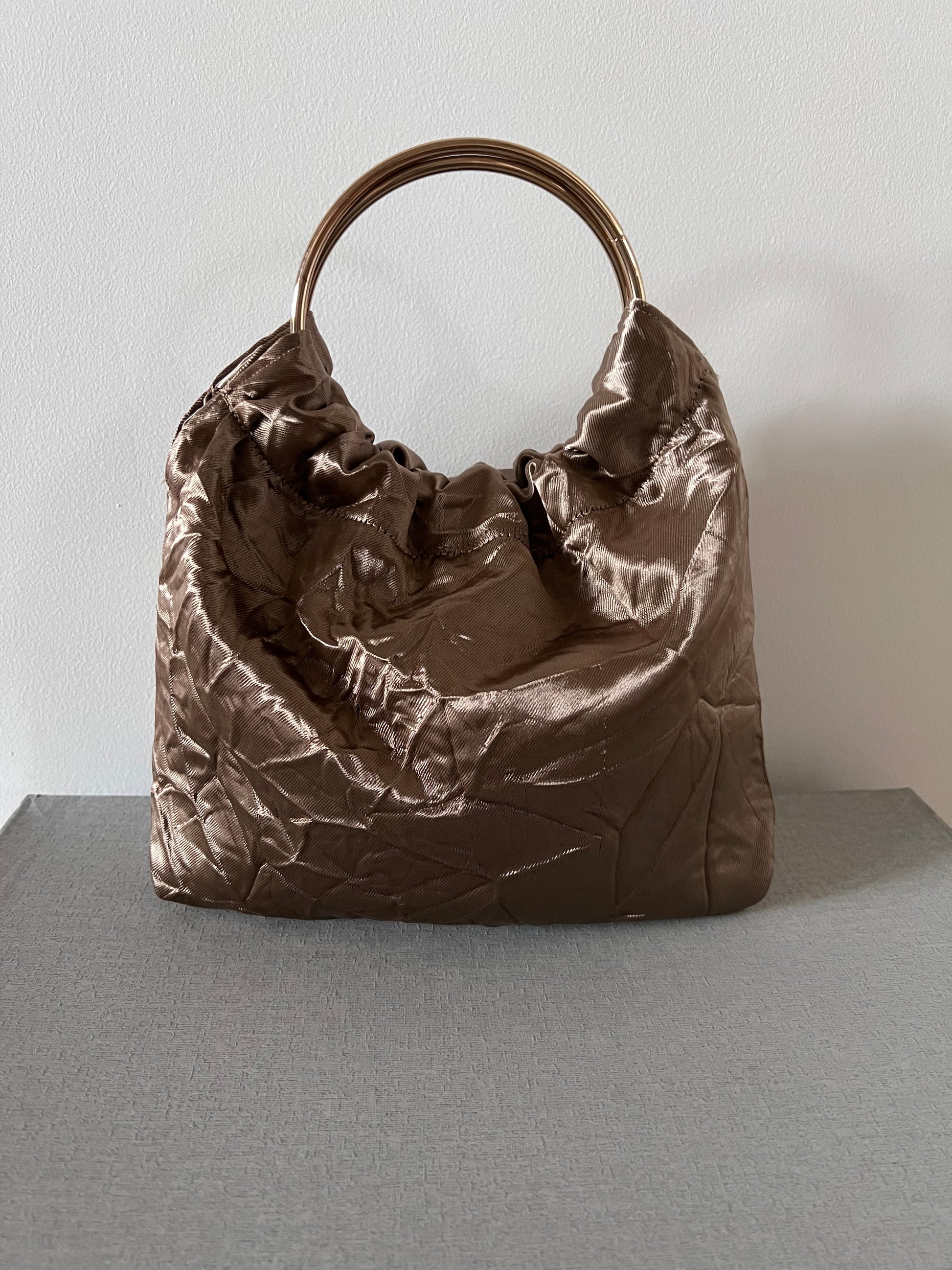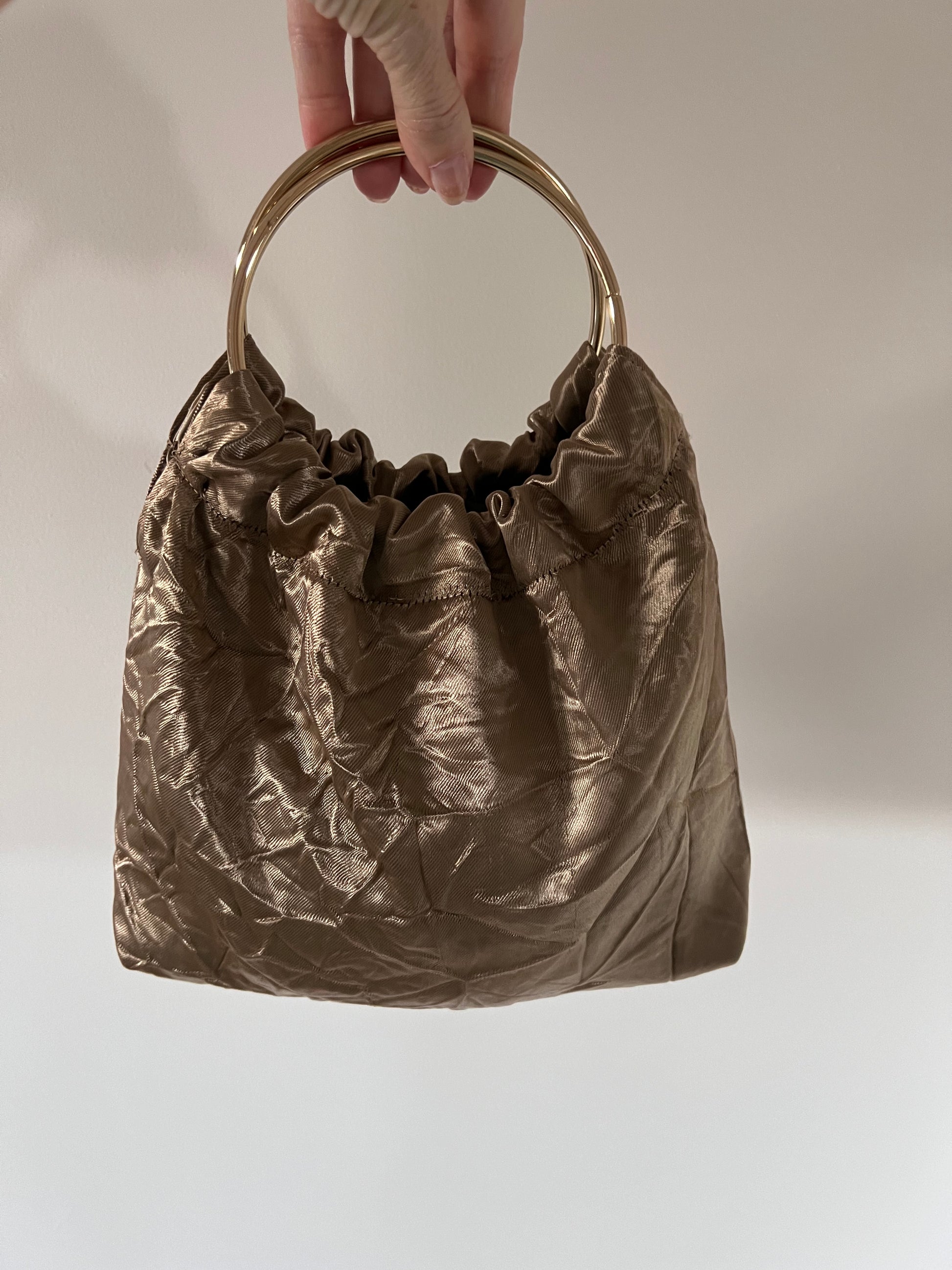 Modelo Gabino en tela satén imitando arruga, con asas doradas.