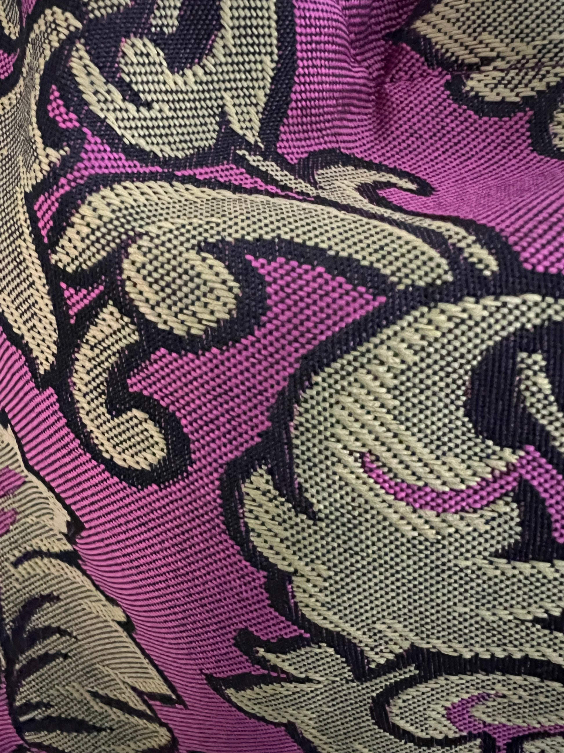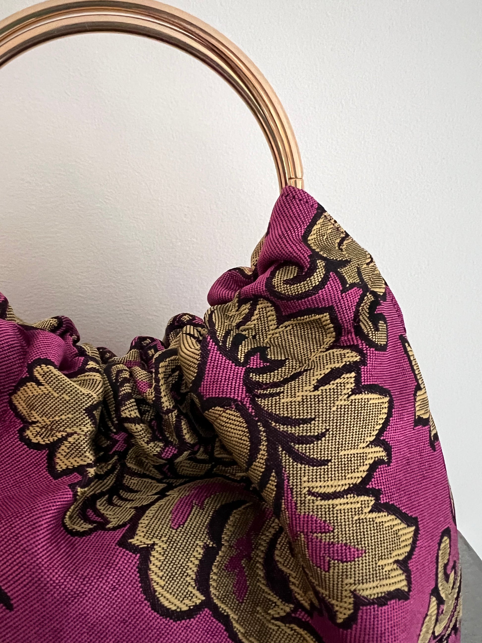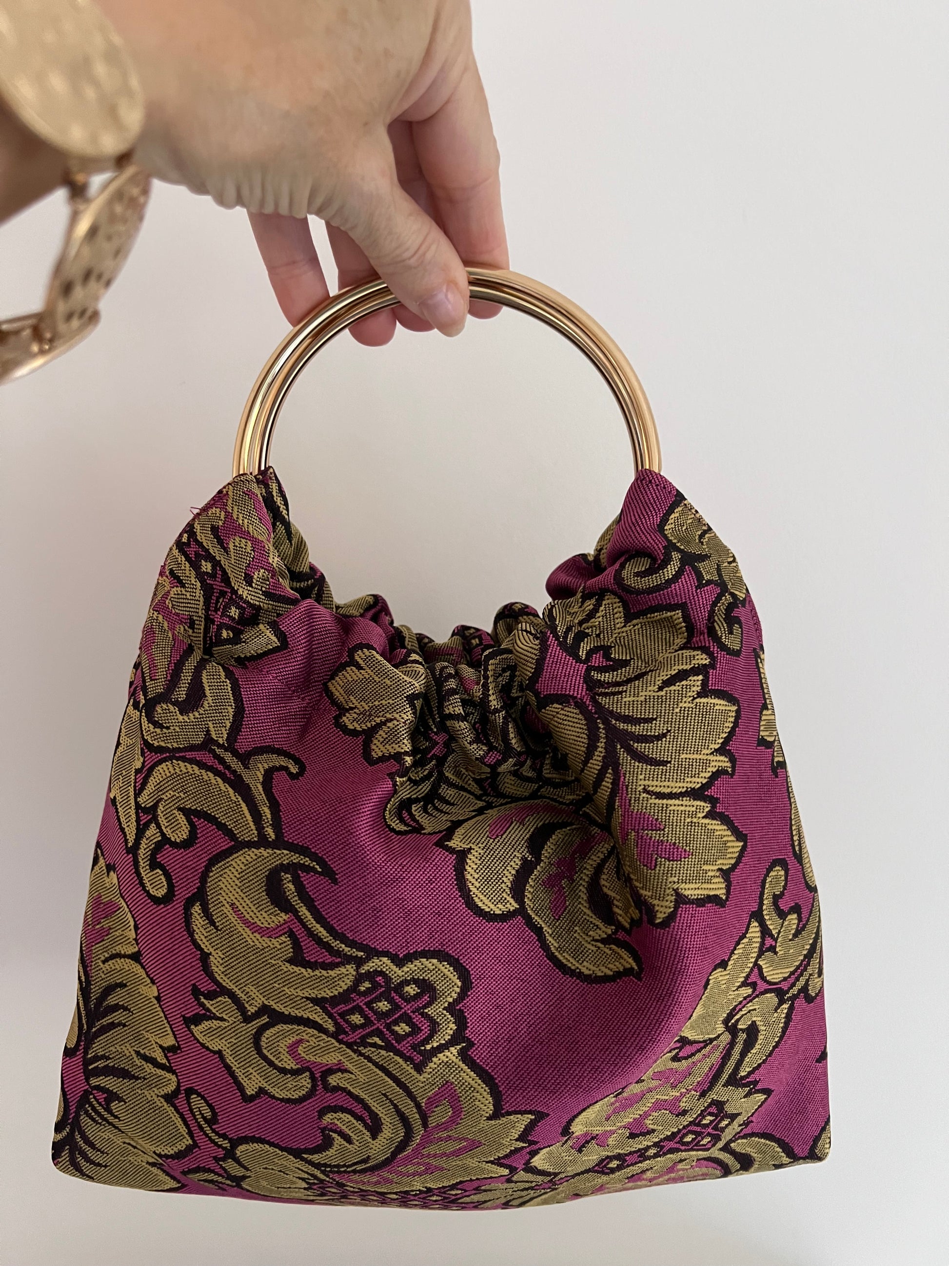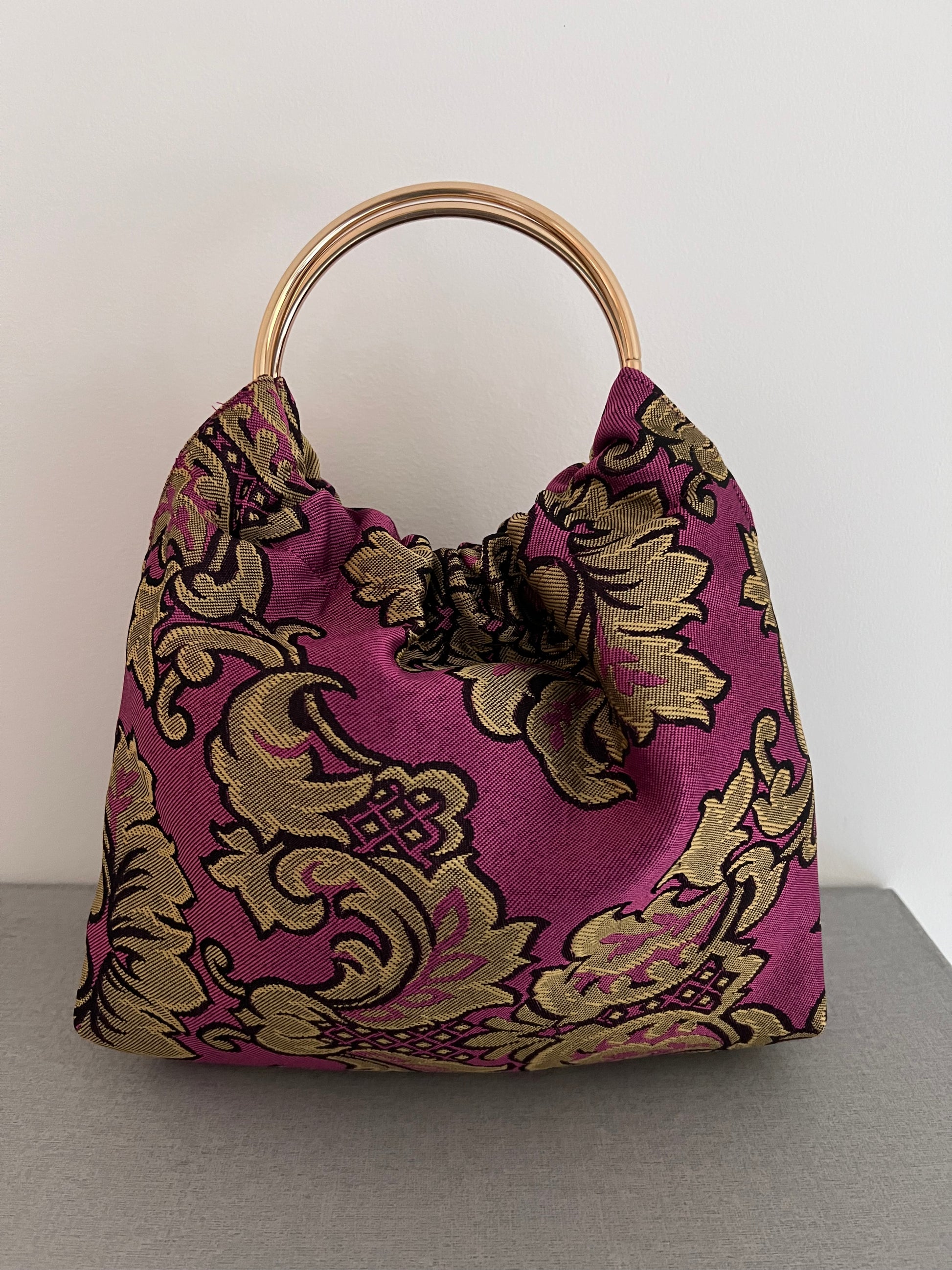 Modelo Gabino en tela estampada en tonos ocres y negro sobre fondo rosa, con asas doradas.