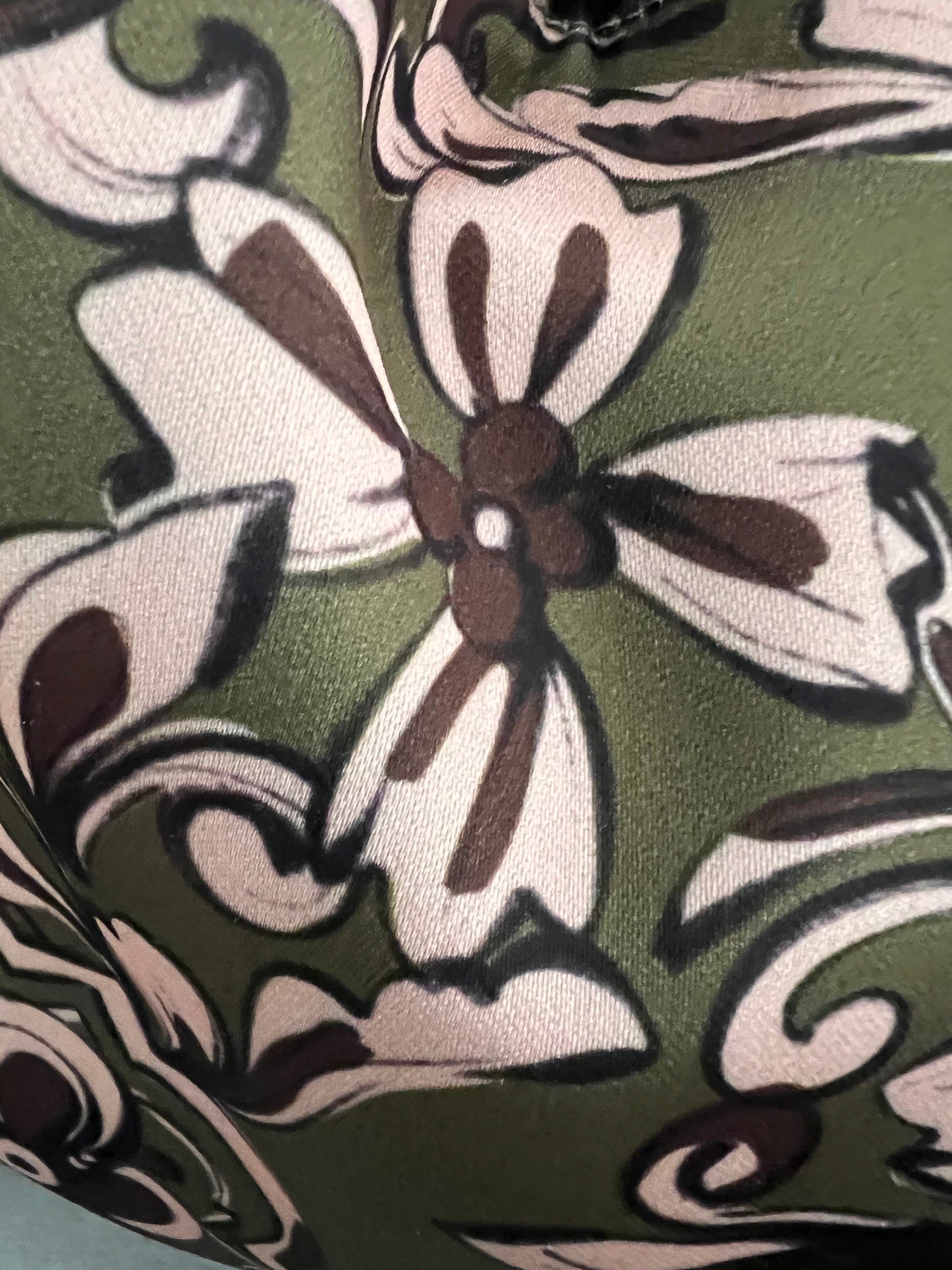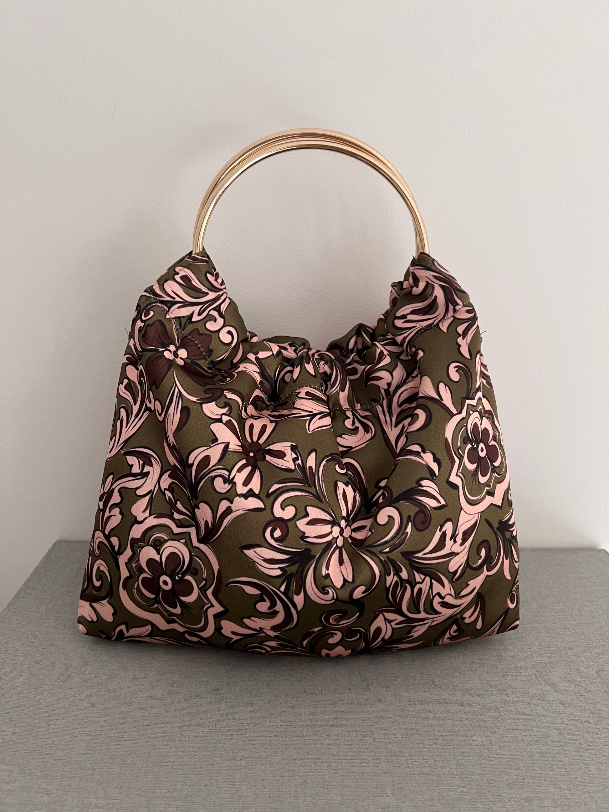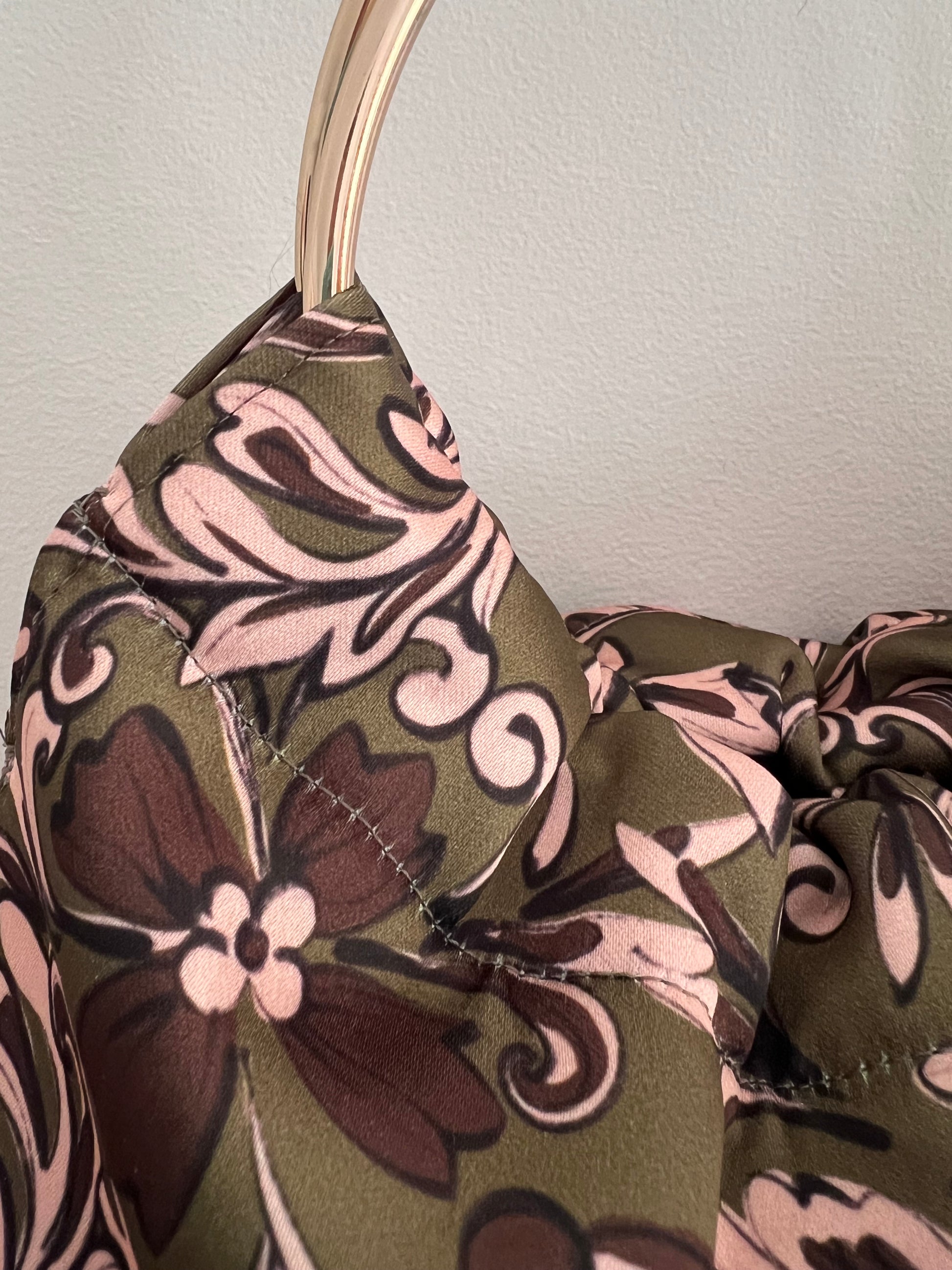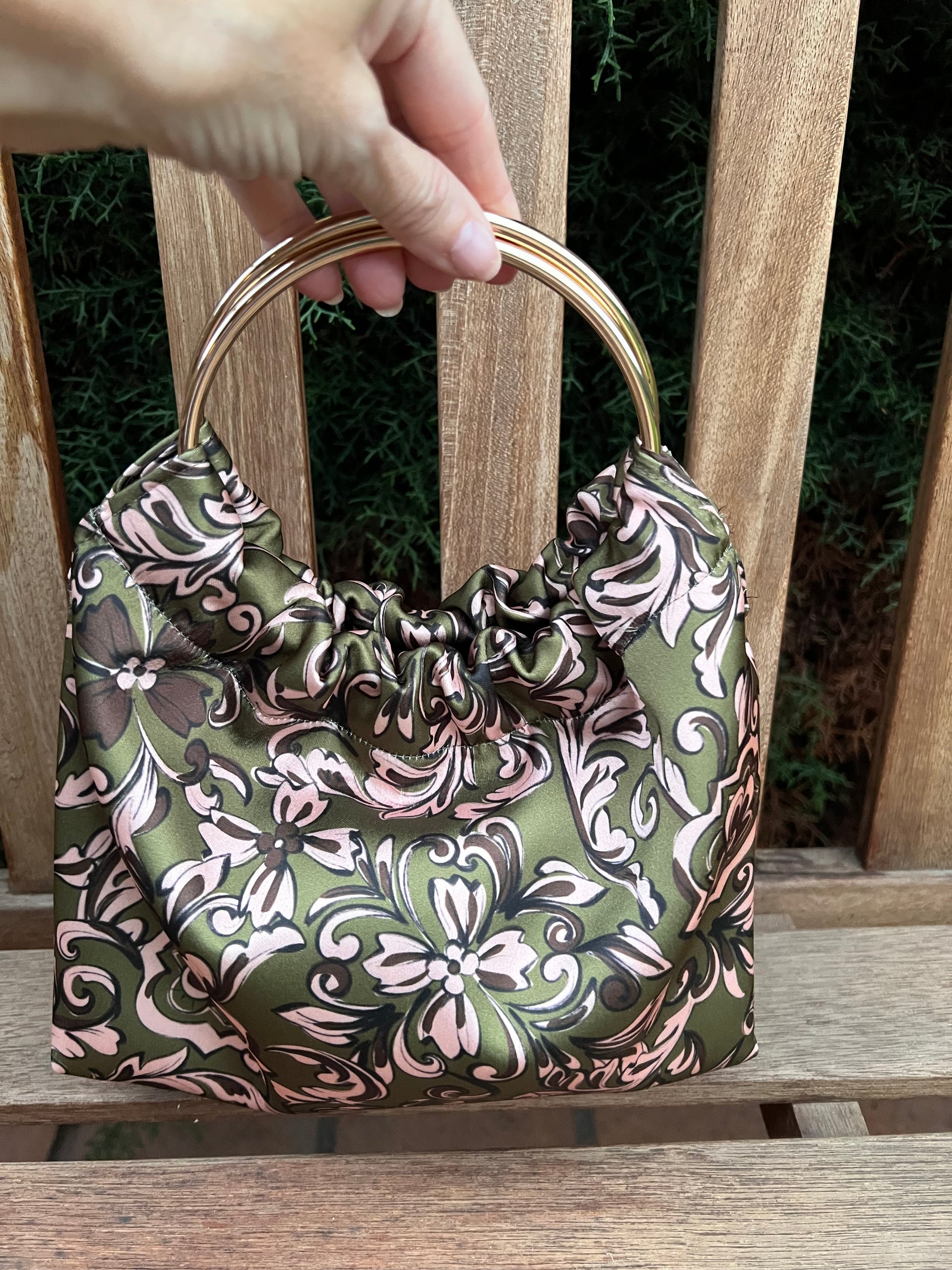 Modelo Gabino en tela satinada en tonos verde oliva, beige y marrón sobre fondo verde, con 2 asas doradas