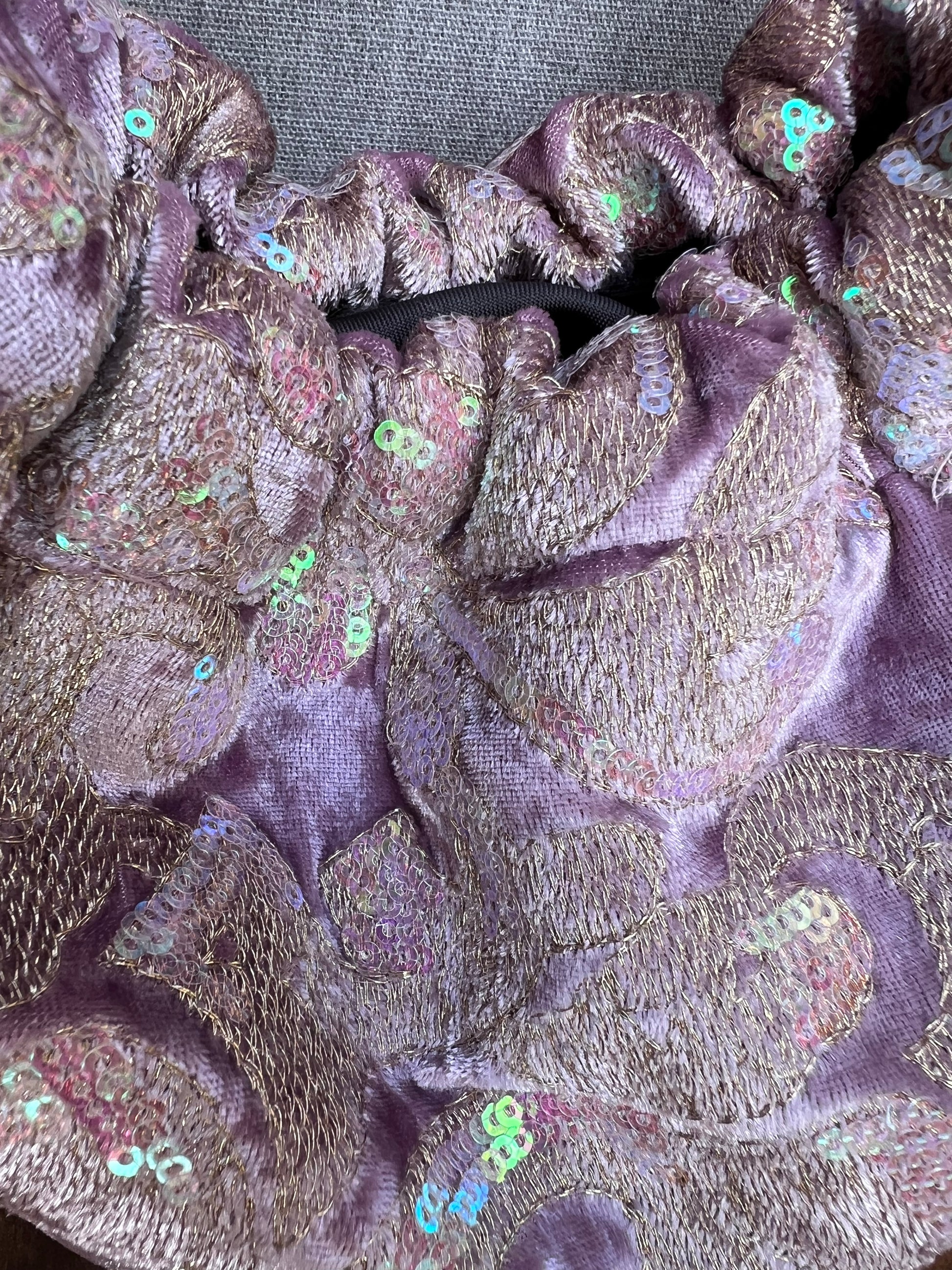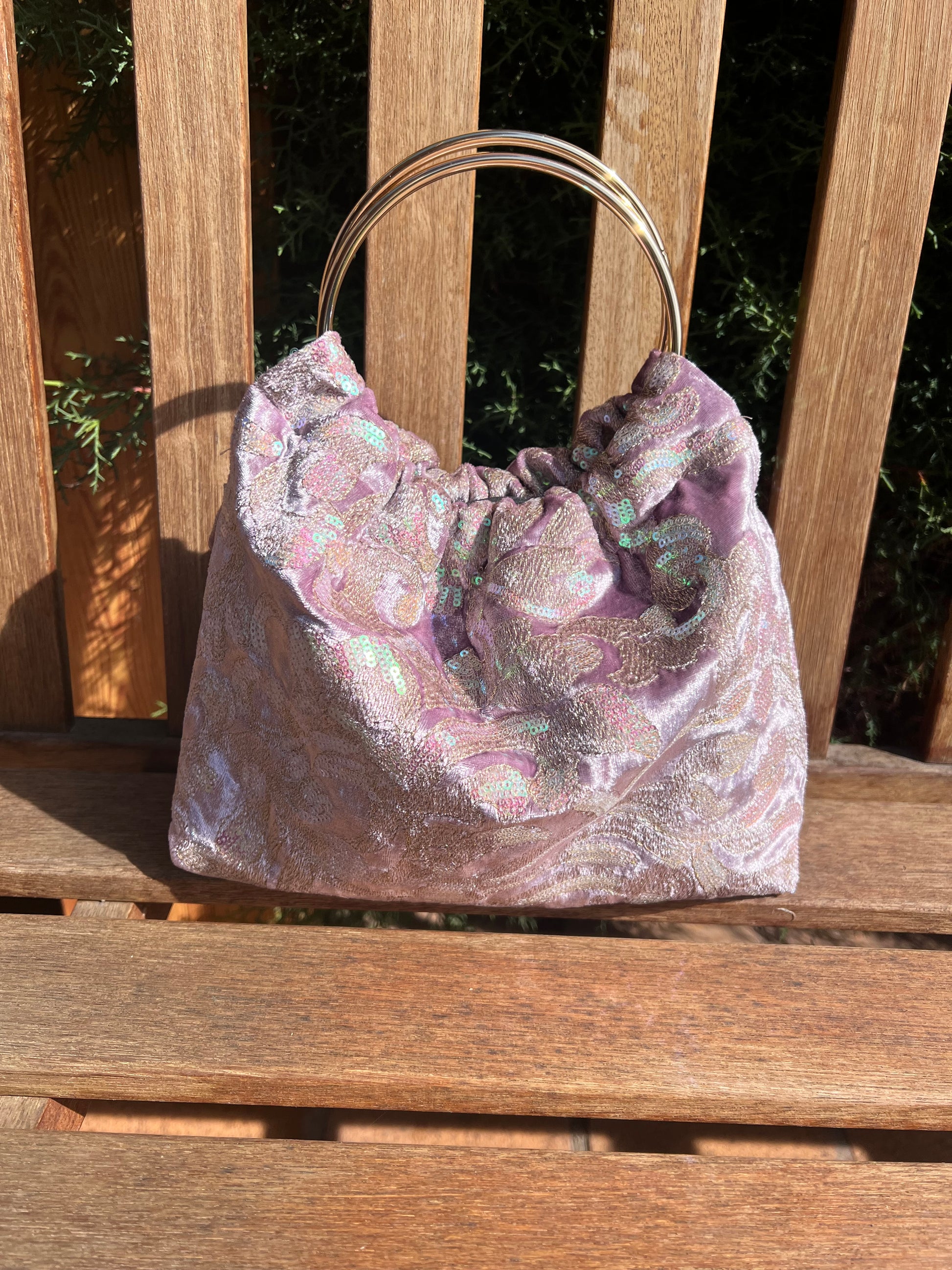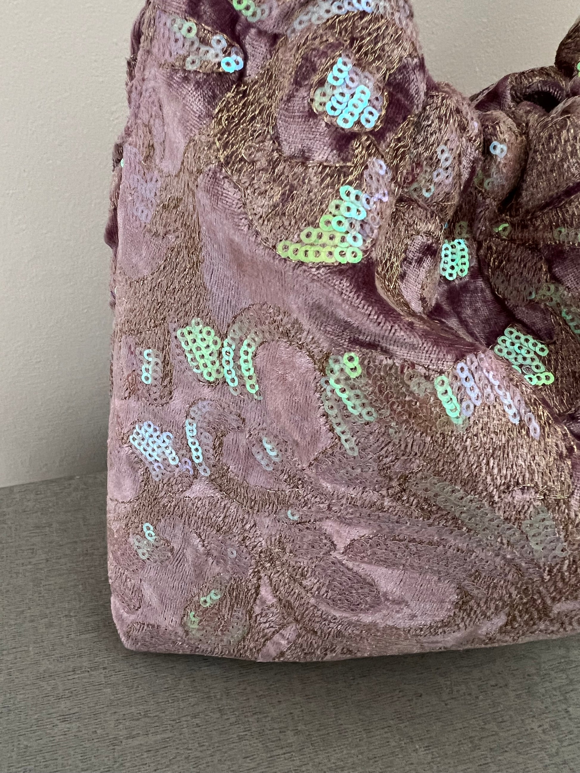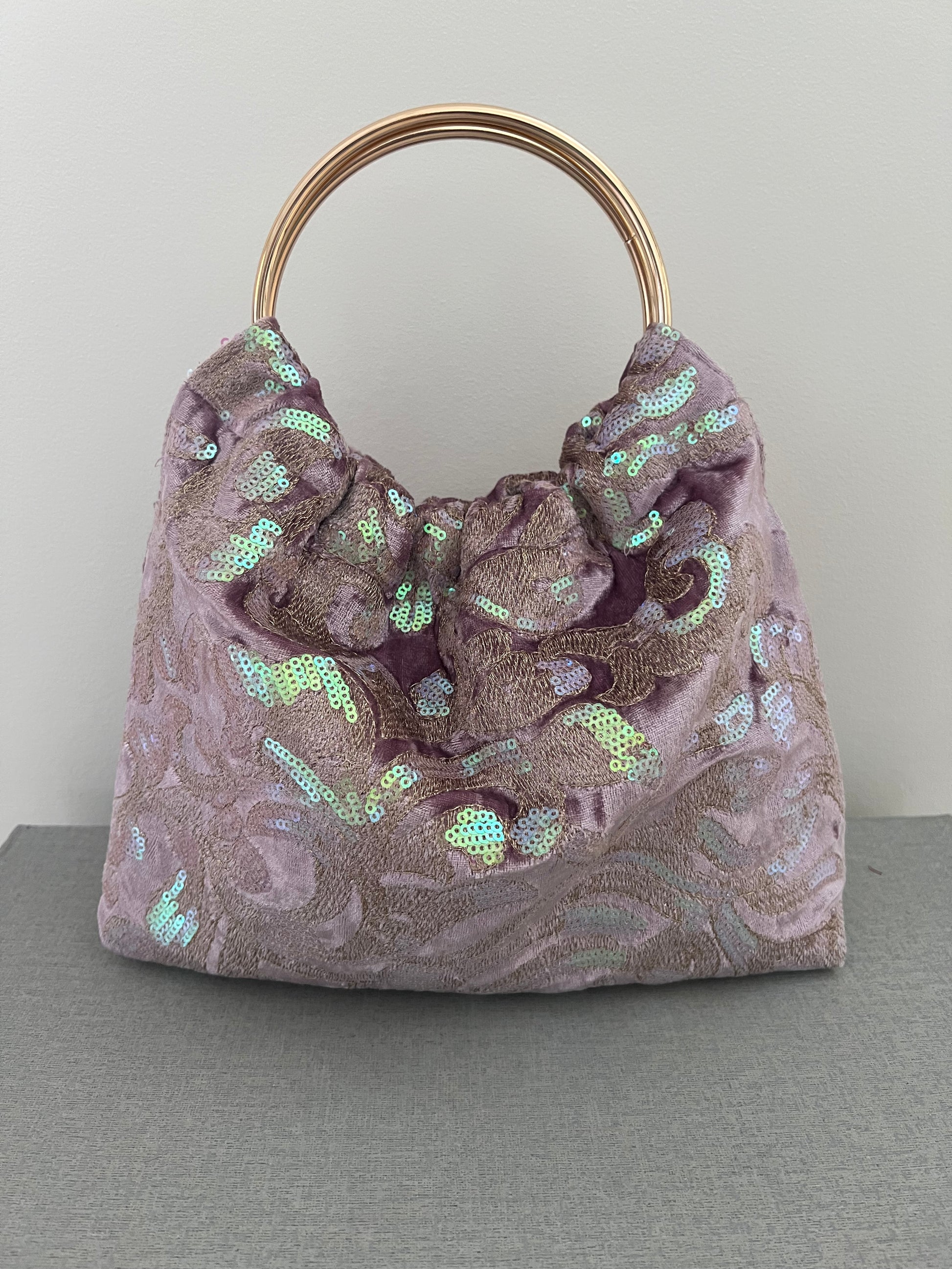 Modelo Gabino en tejido de terciopelo lila con bordado metálico y lentejuelas tornasoladas. Su brillo cambia según la luz, creando un efecto suave y luminoso, con 2 asas doradas.