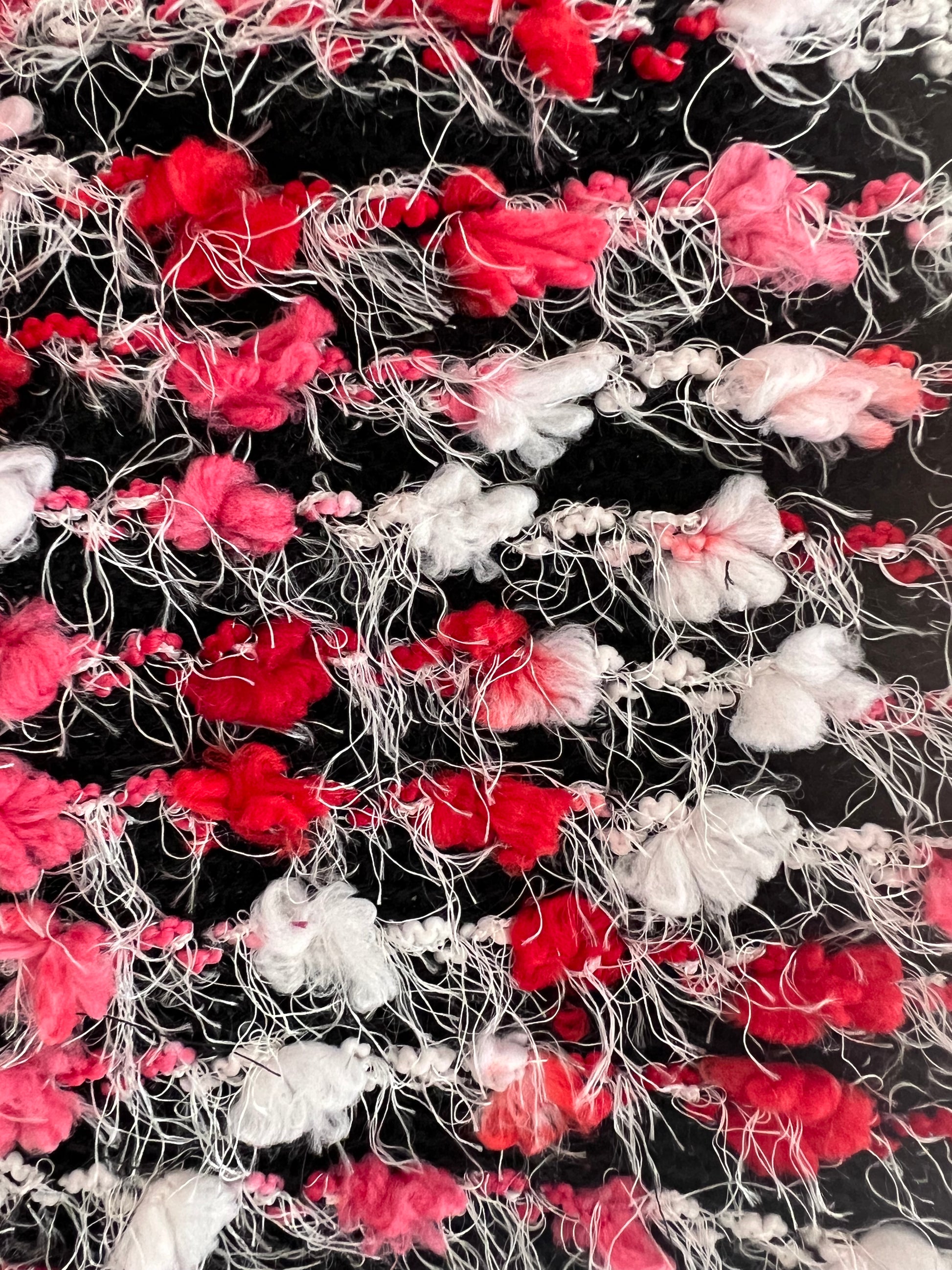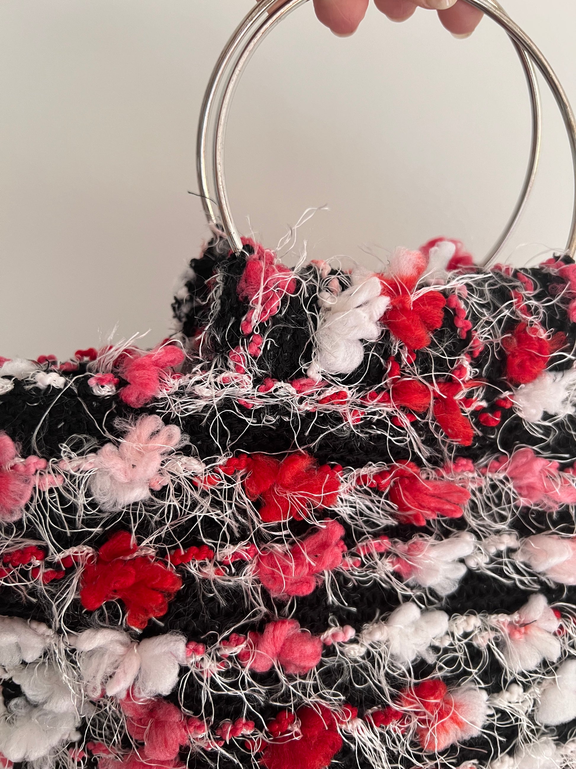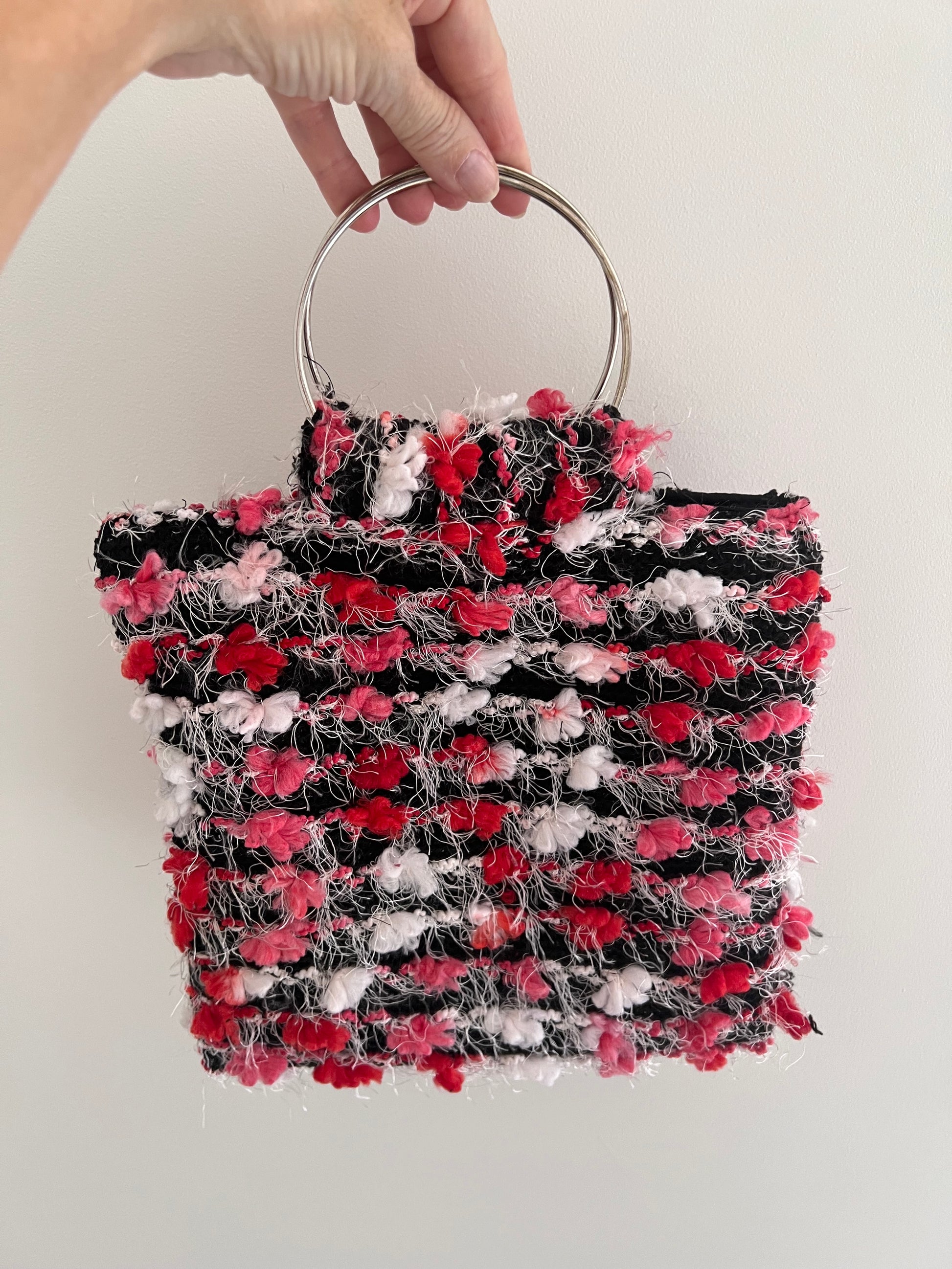 Modelo Gabino mini, en tela de lana trenzada con mezcla de tonos rojos, rosas y blancos sobre base negra, tiene botón de imán interior a modo de cierre y 2 asas plateadas.