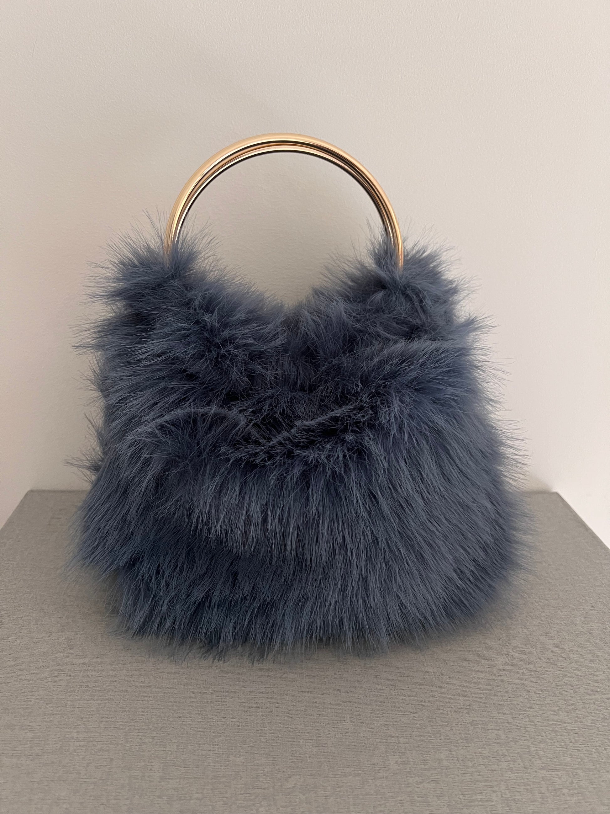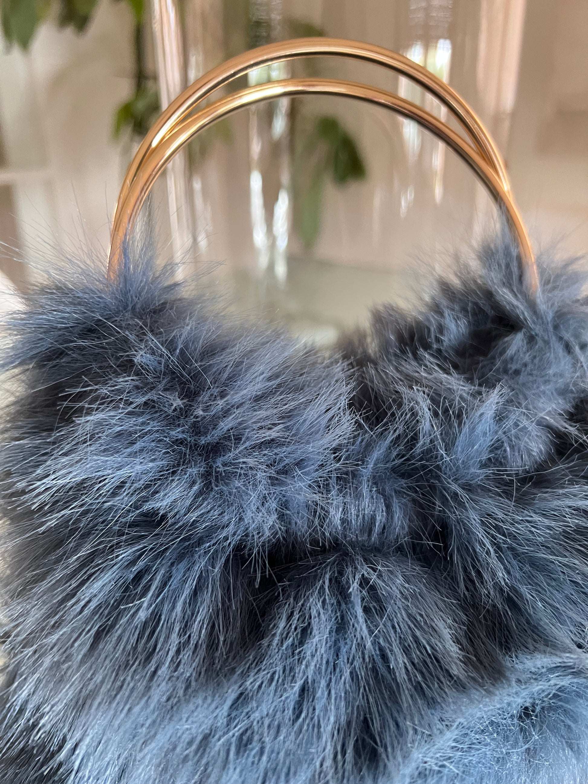 Modelo Gabino mini, en tela de pelo color azul, dos asas doradas.