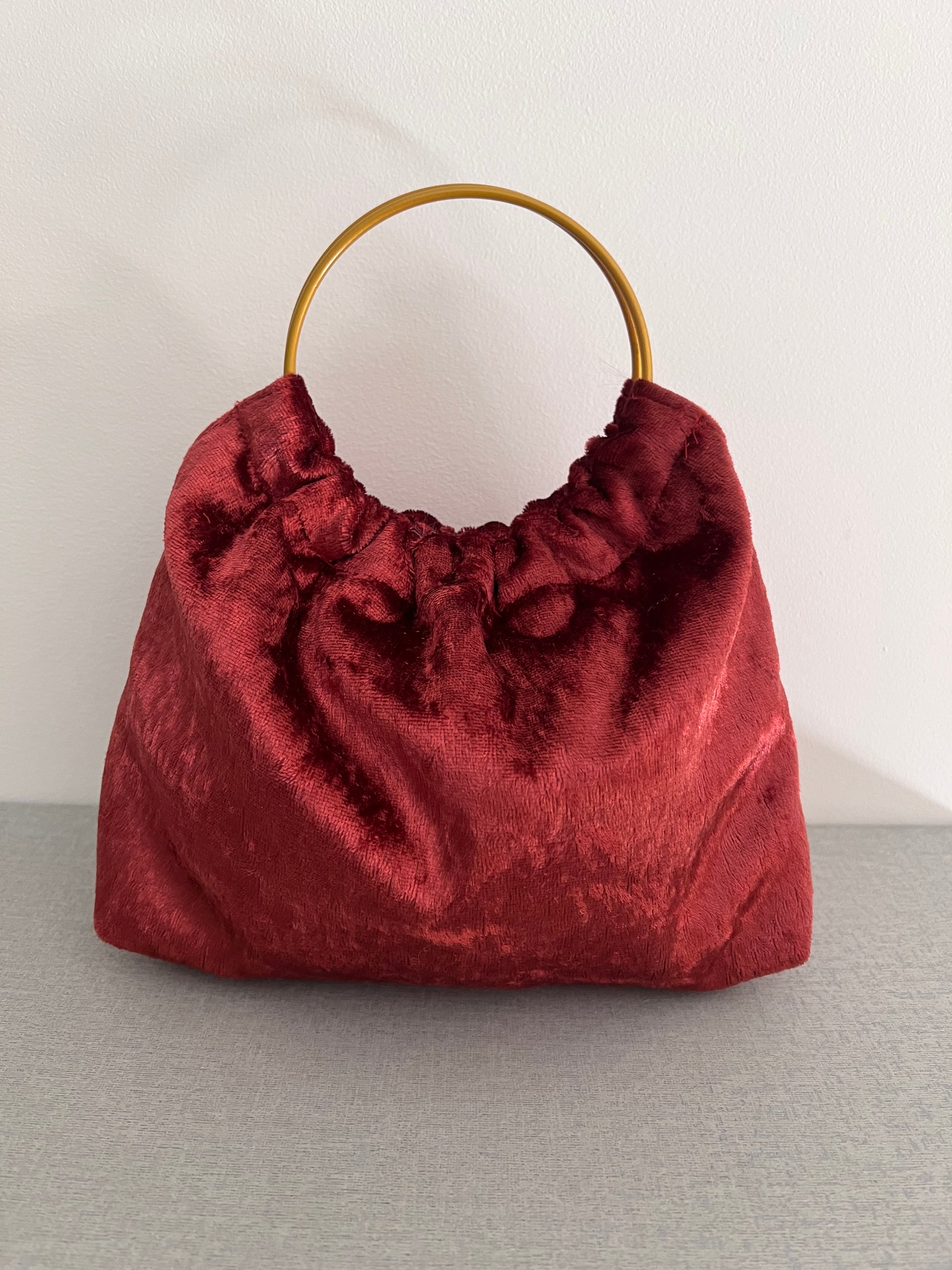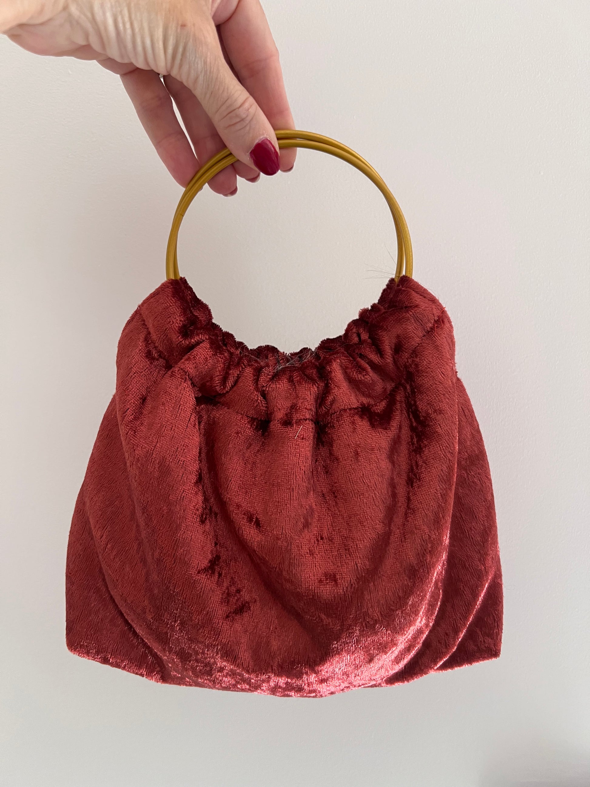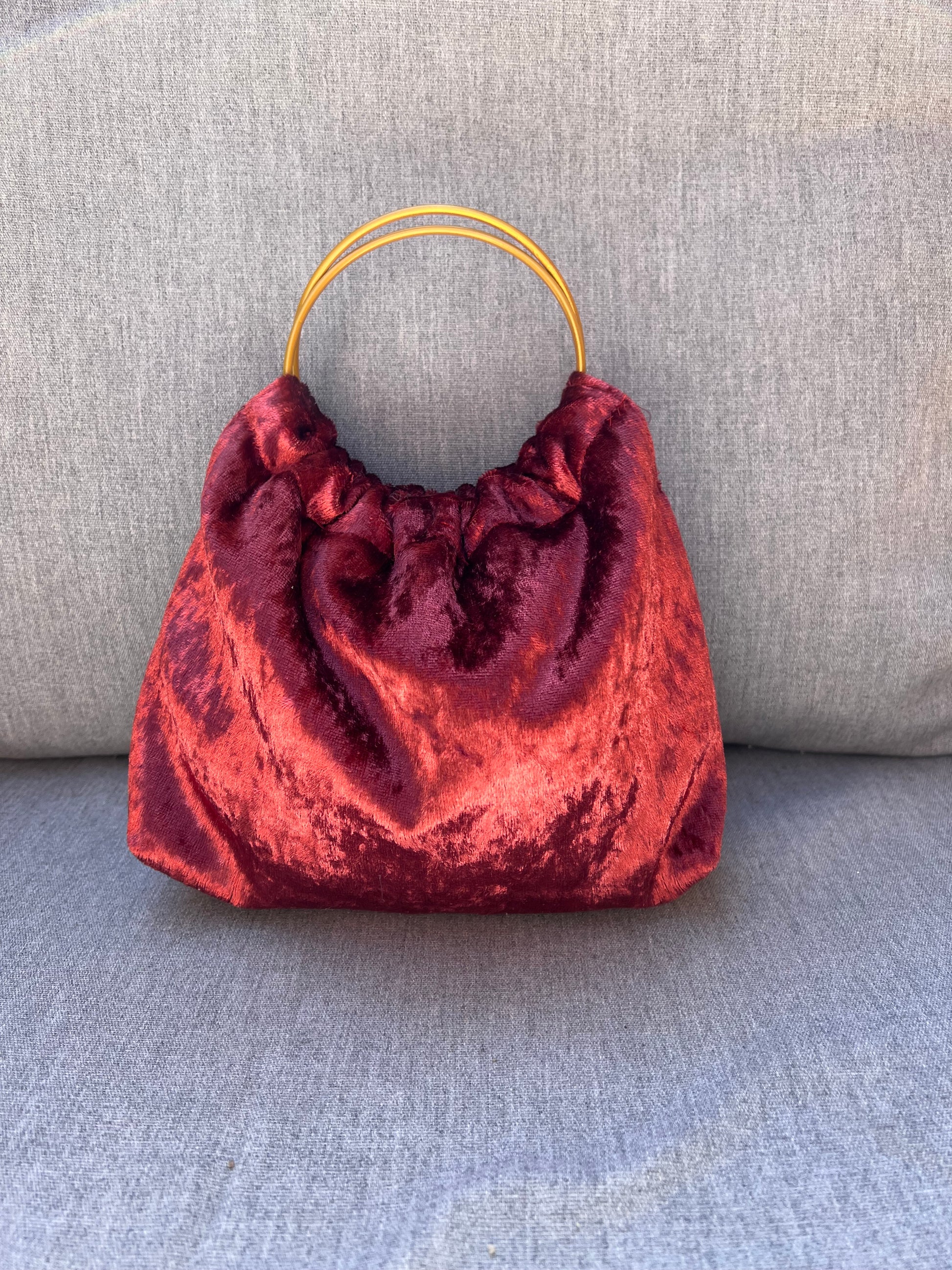 Modelo Gabino Mini, en terciopelo rojo teja , con asas doradas mates.