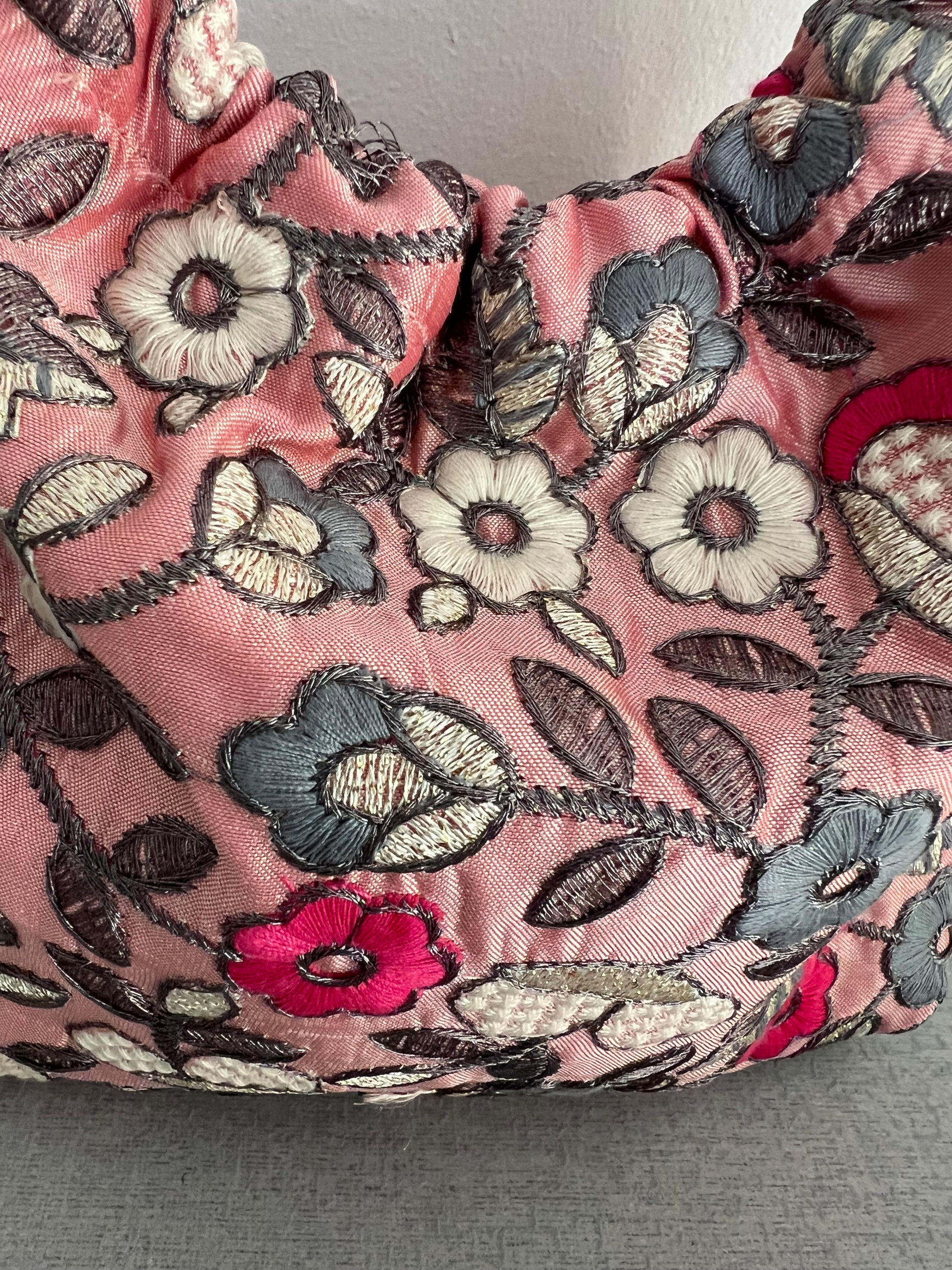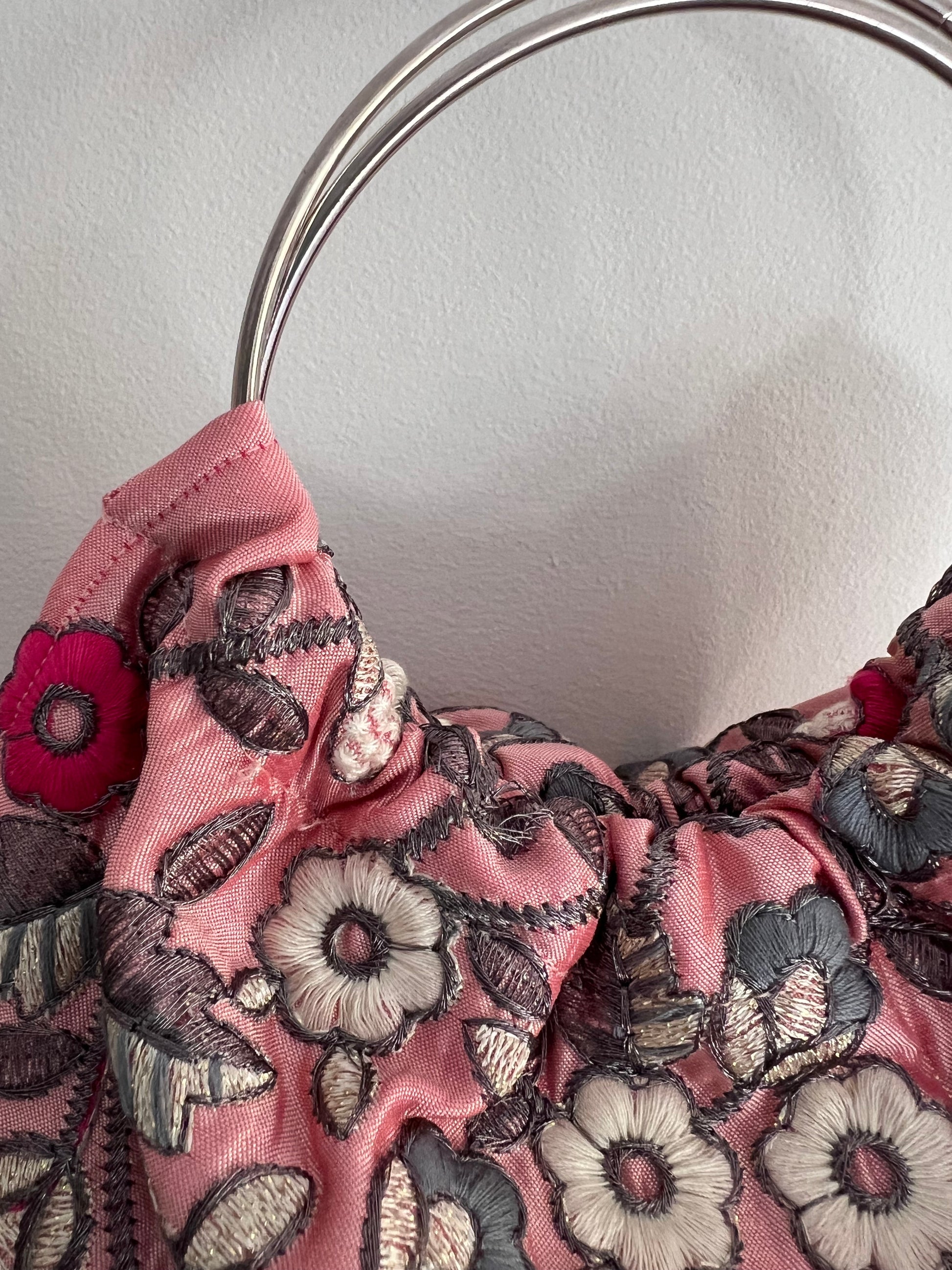 Modelo Gabino mini en tejido satinado con bordado floral en tonos rosas, grises y cereza, sobre fondo rosa, 2 asas plateadas.