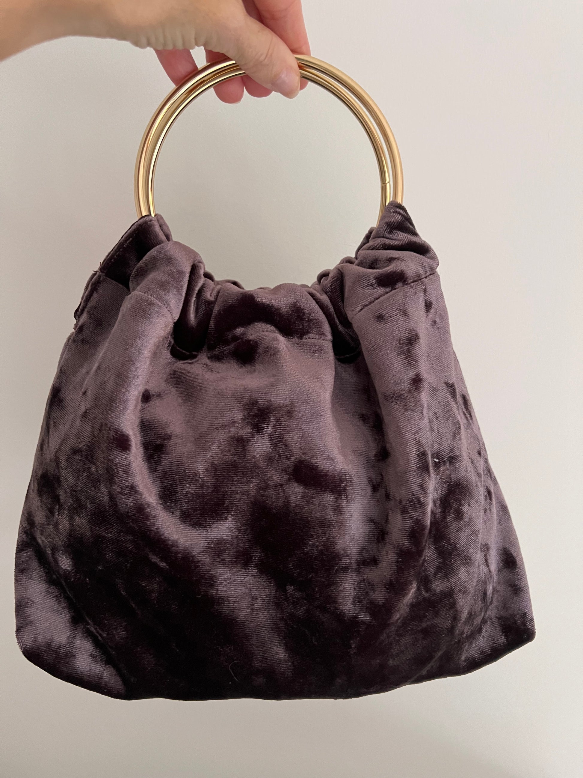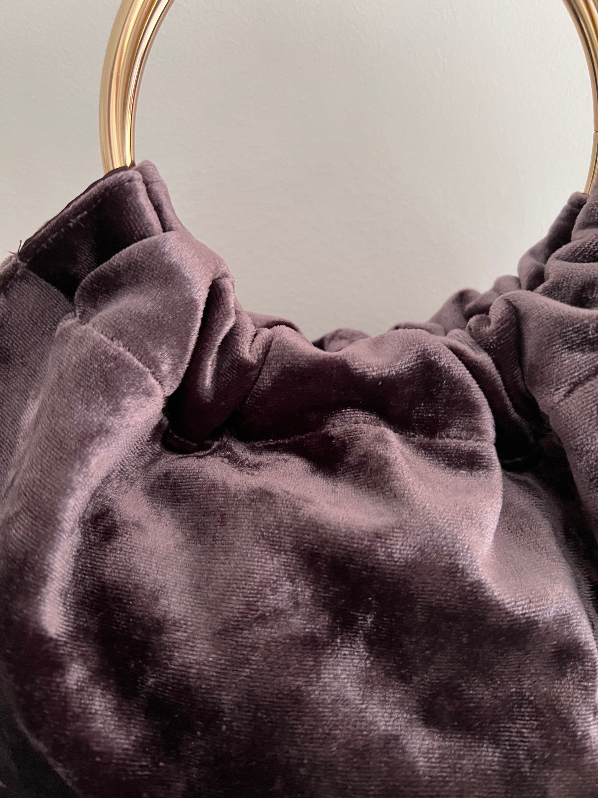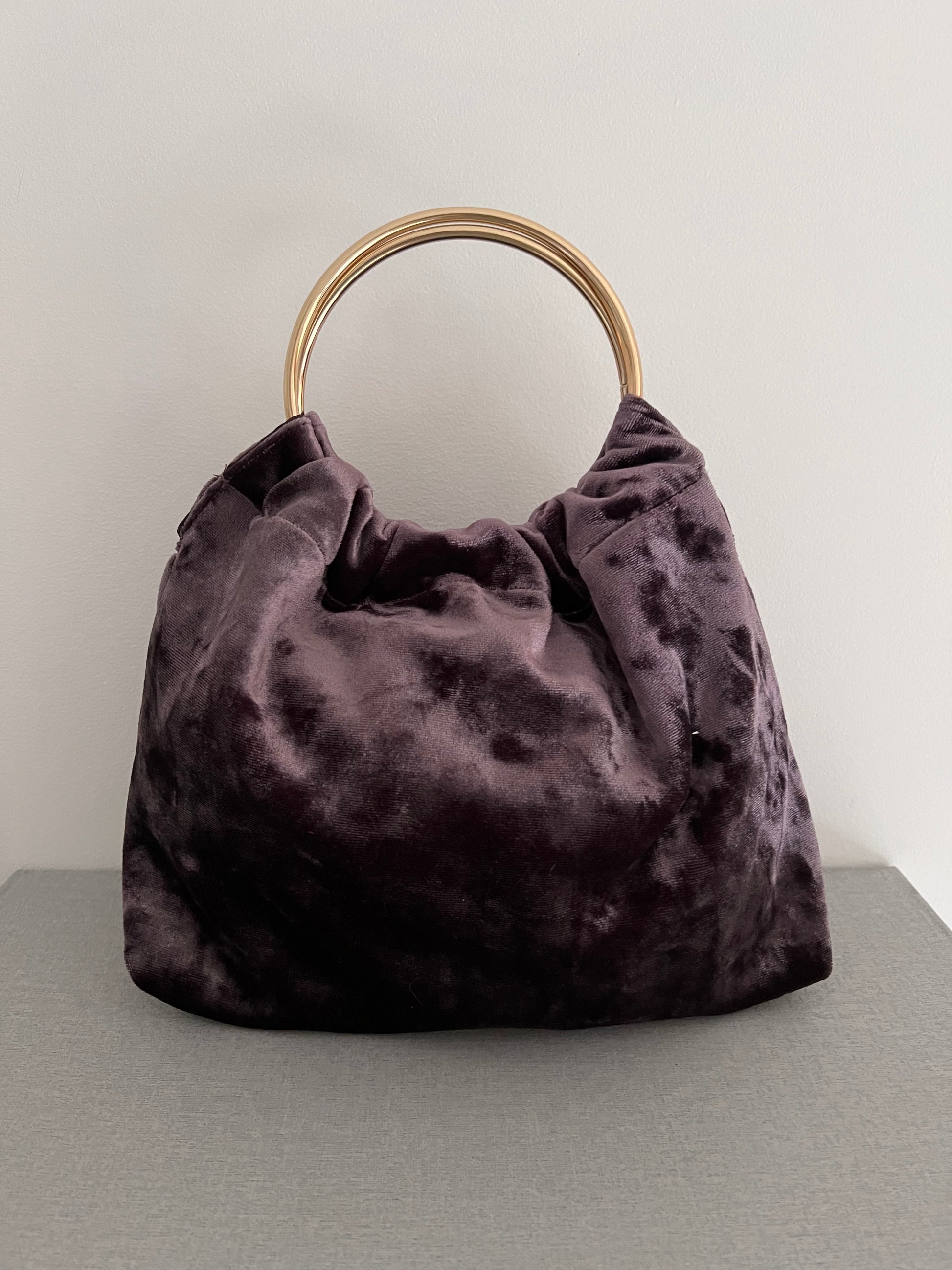 Modelo Gabino en Terciopelo suave en tono ciruela oscuro, con dos asas doradas.