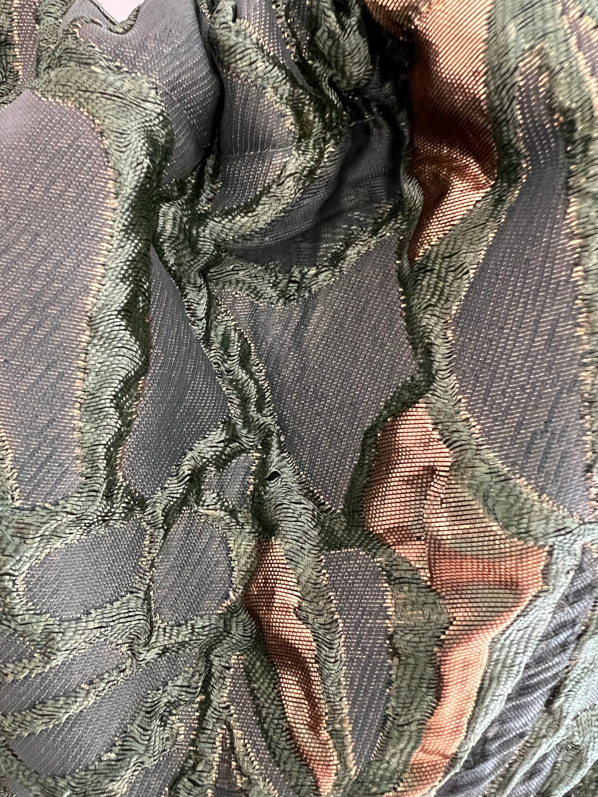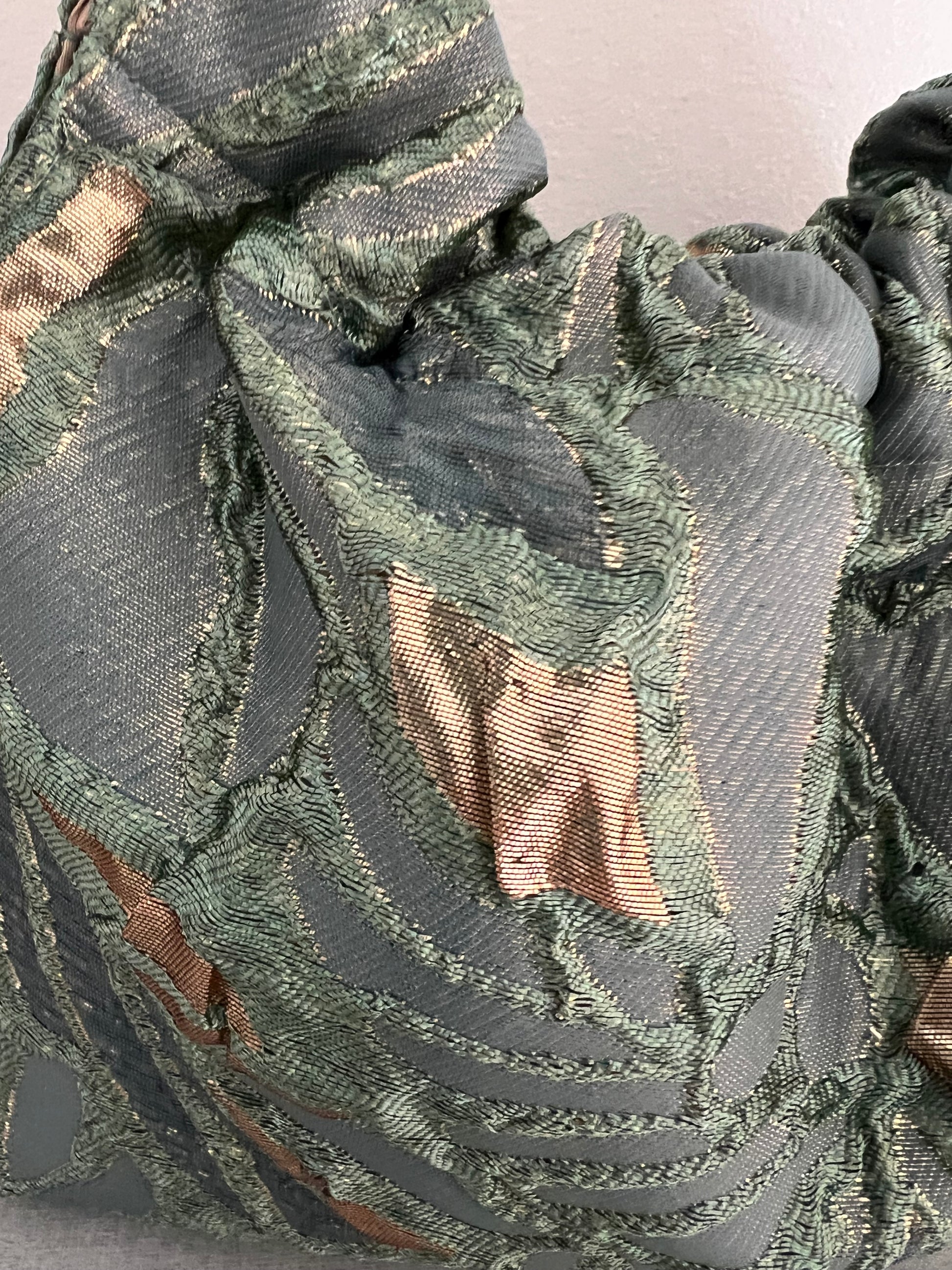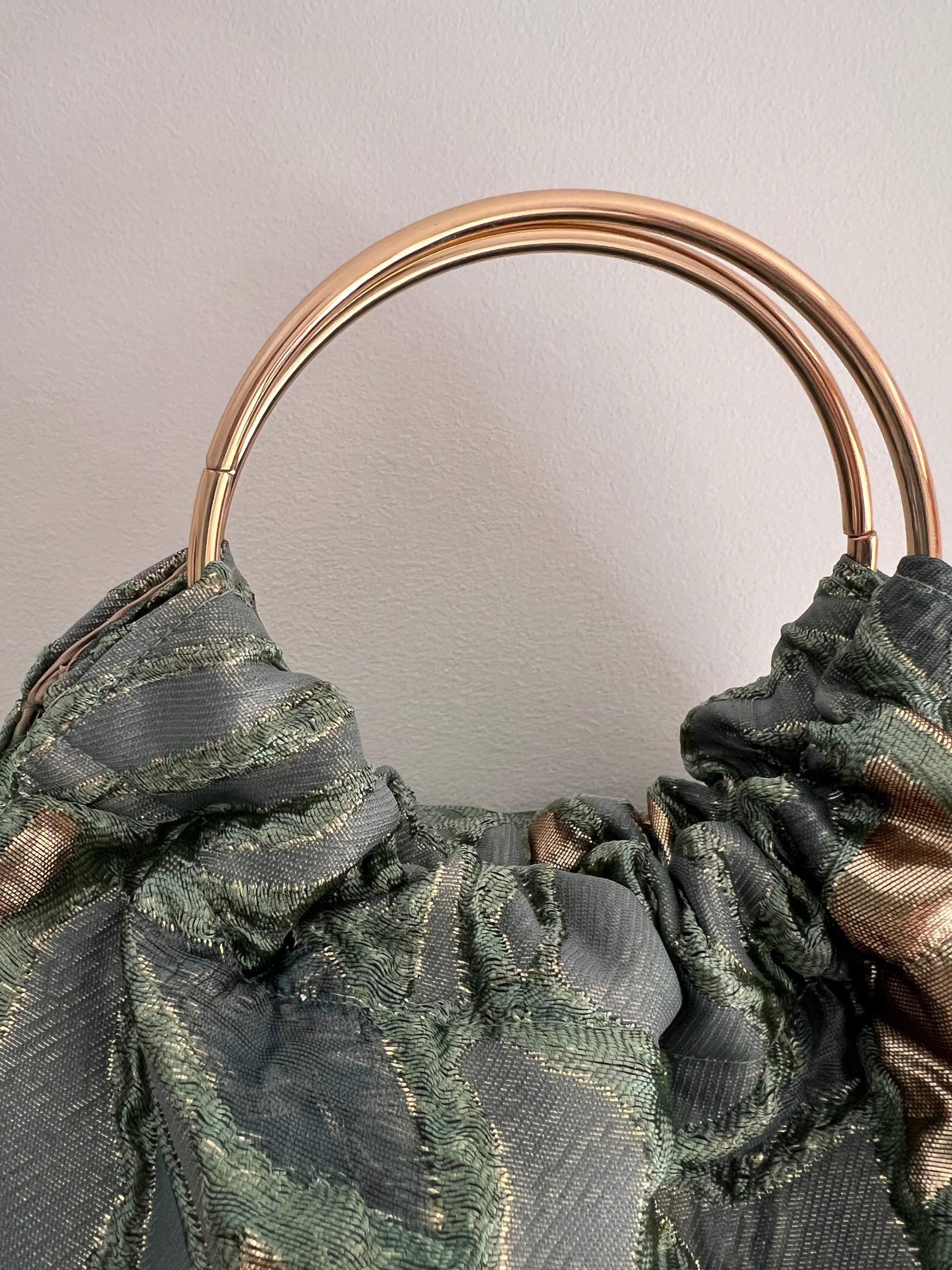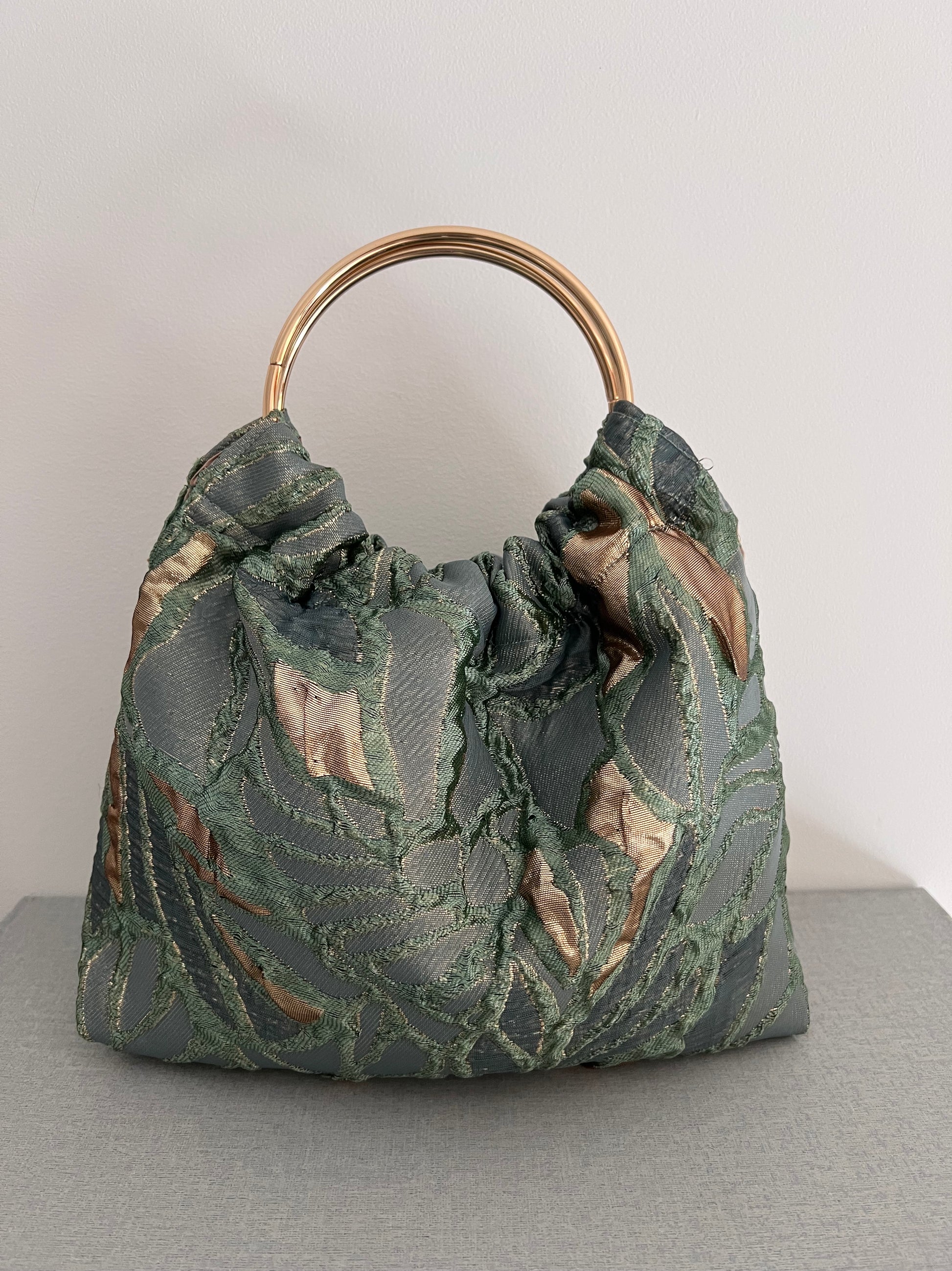 Gabino en Jacquard verde y dorado, con hilos dorados, textura orgánica y brillo sutil, con asas doradas.