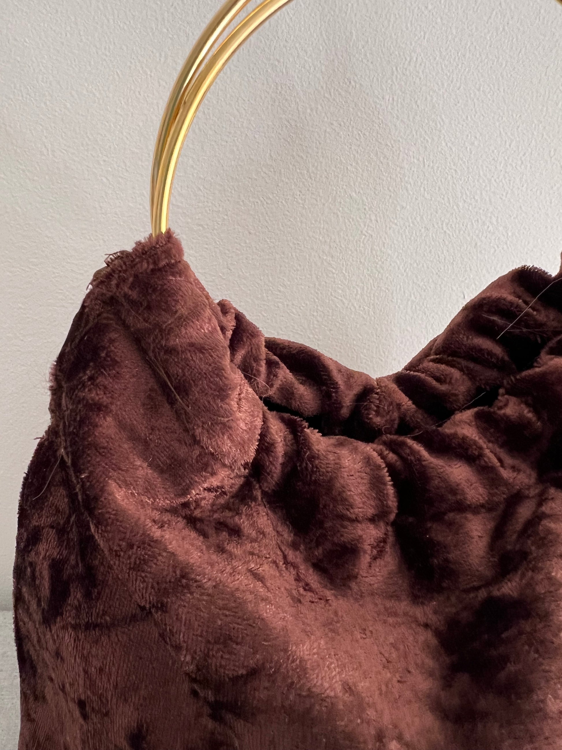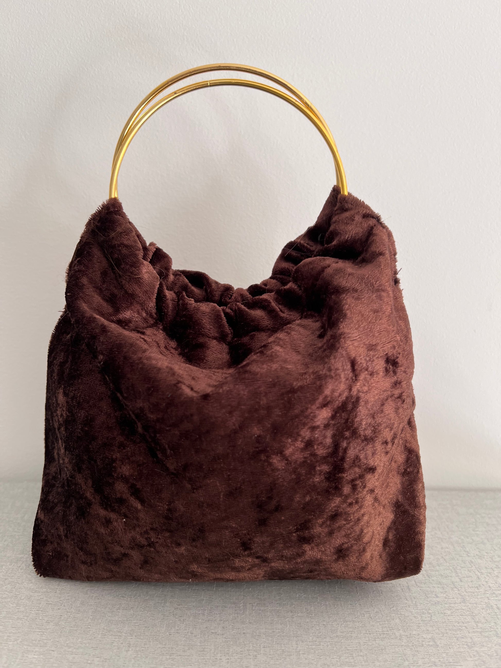 Modelo Gabino en terciopelo fino marrón chocolate, con asas doradas.