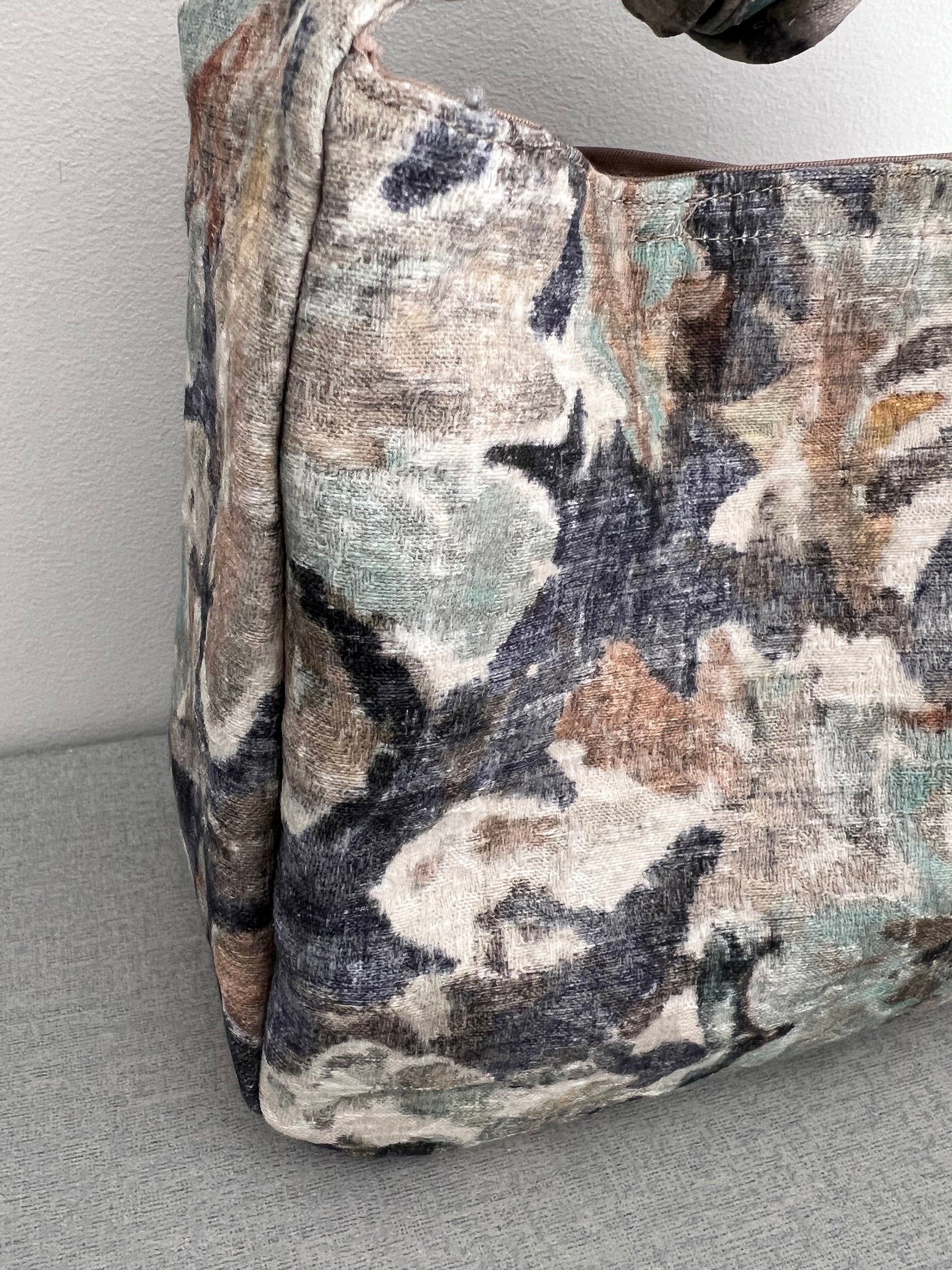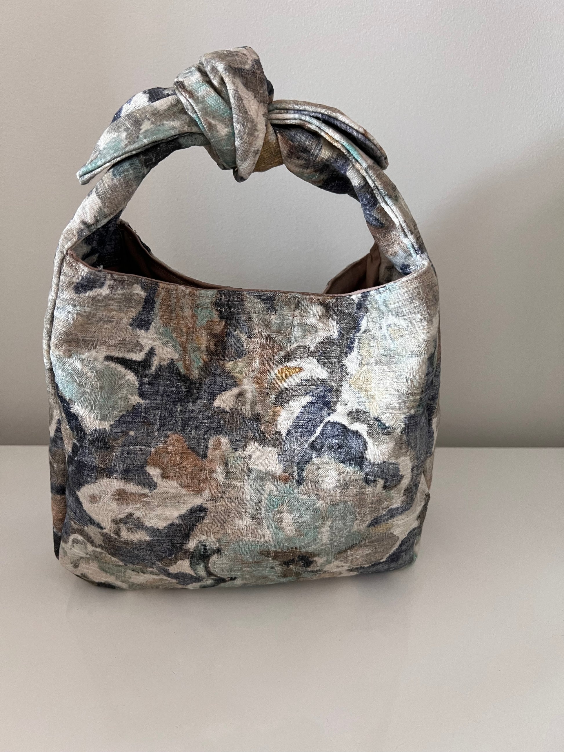 Modelo Ginevra en tejido jacquard satinado con textura en colores suaves, con asa anudada, lleva botón de imán interior.