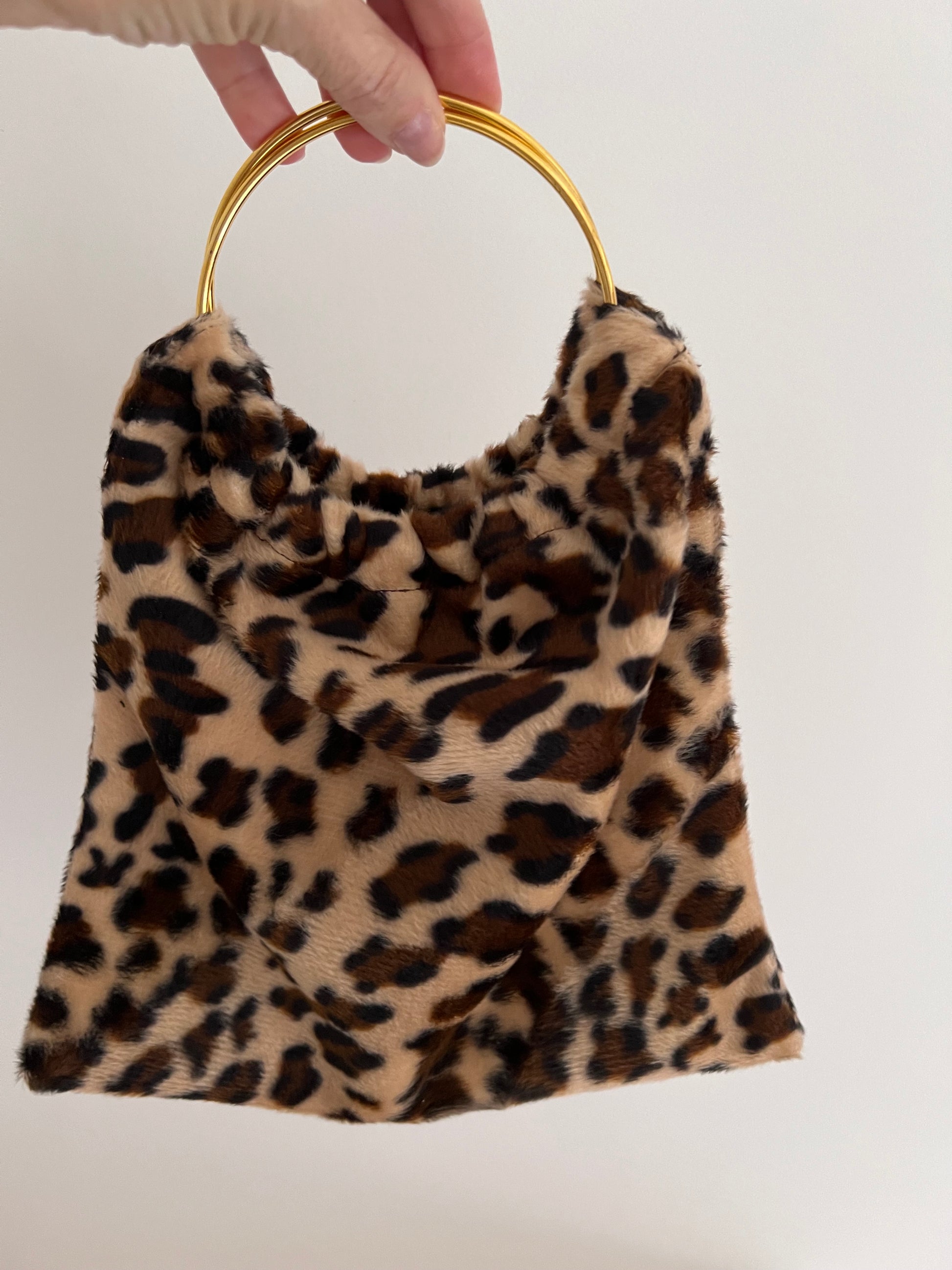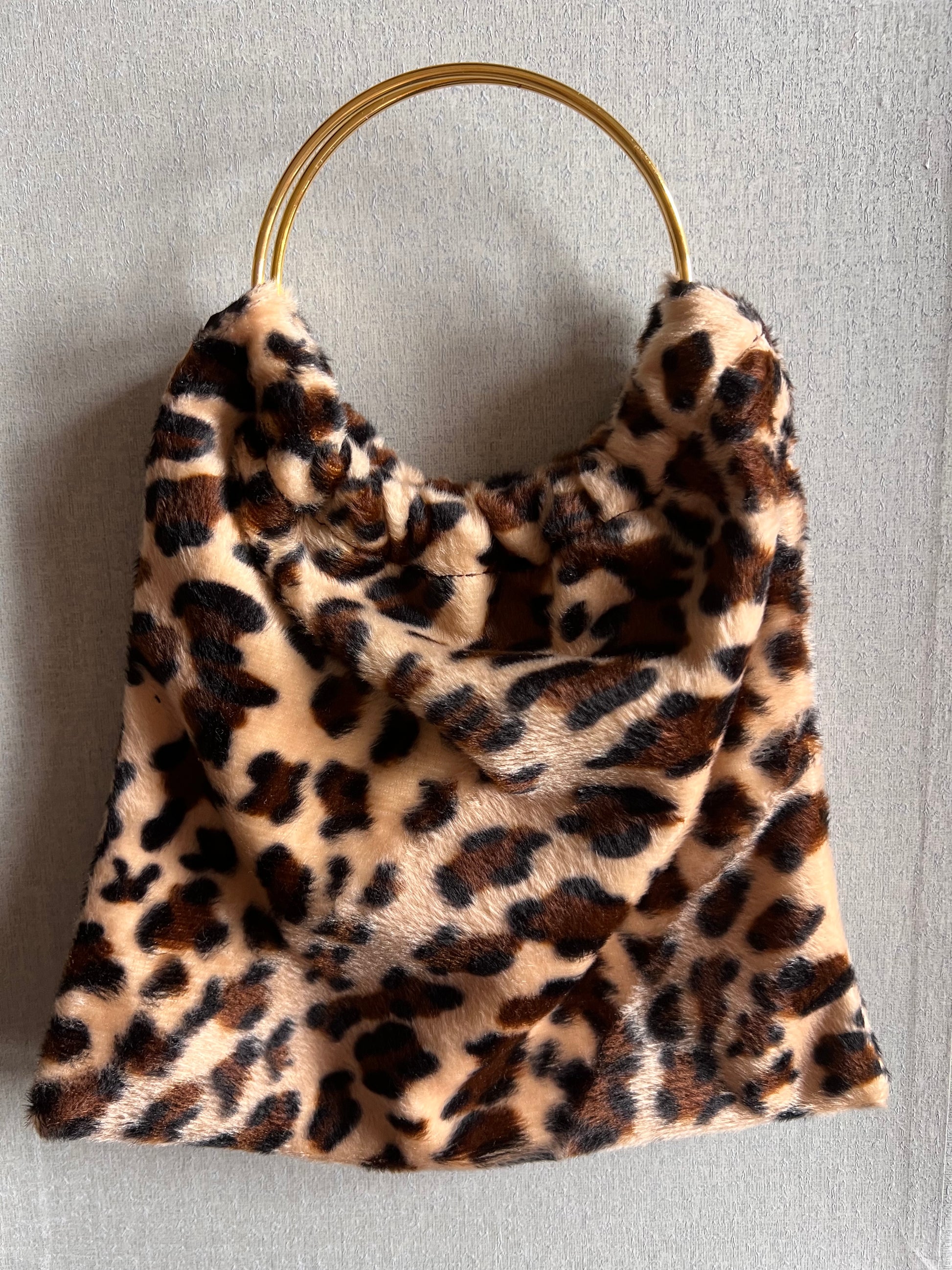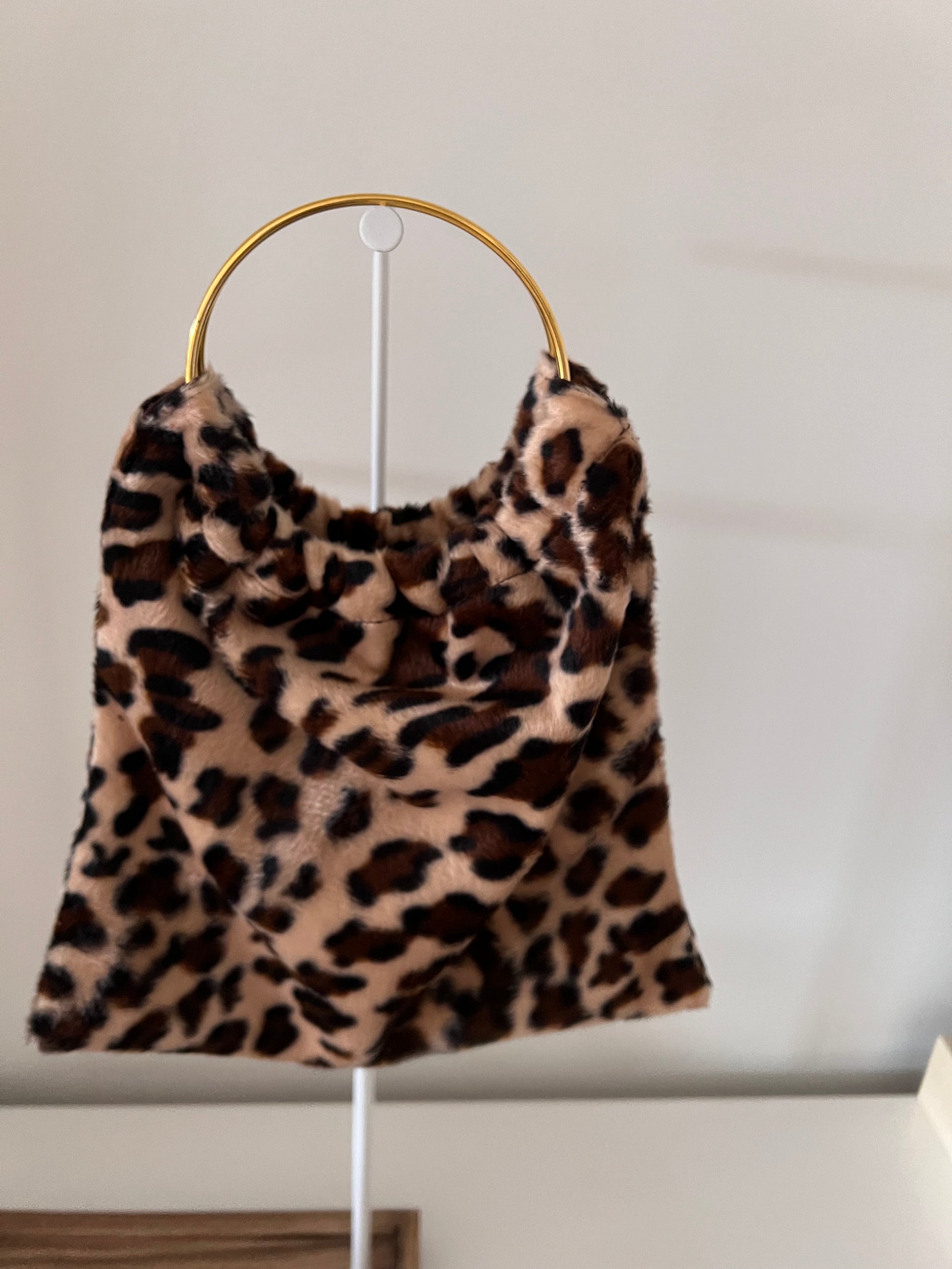 Modelo Pippa, en tejido de pelo corto con estampado animal print en tonos beige, marrón y negro, con dos asas doradas.