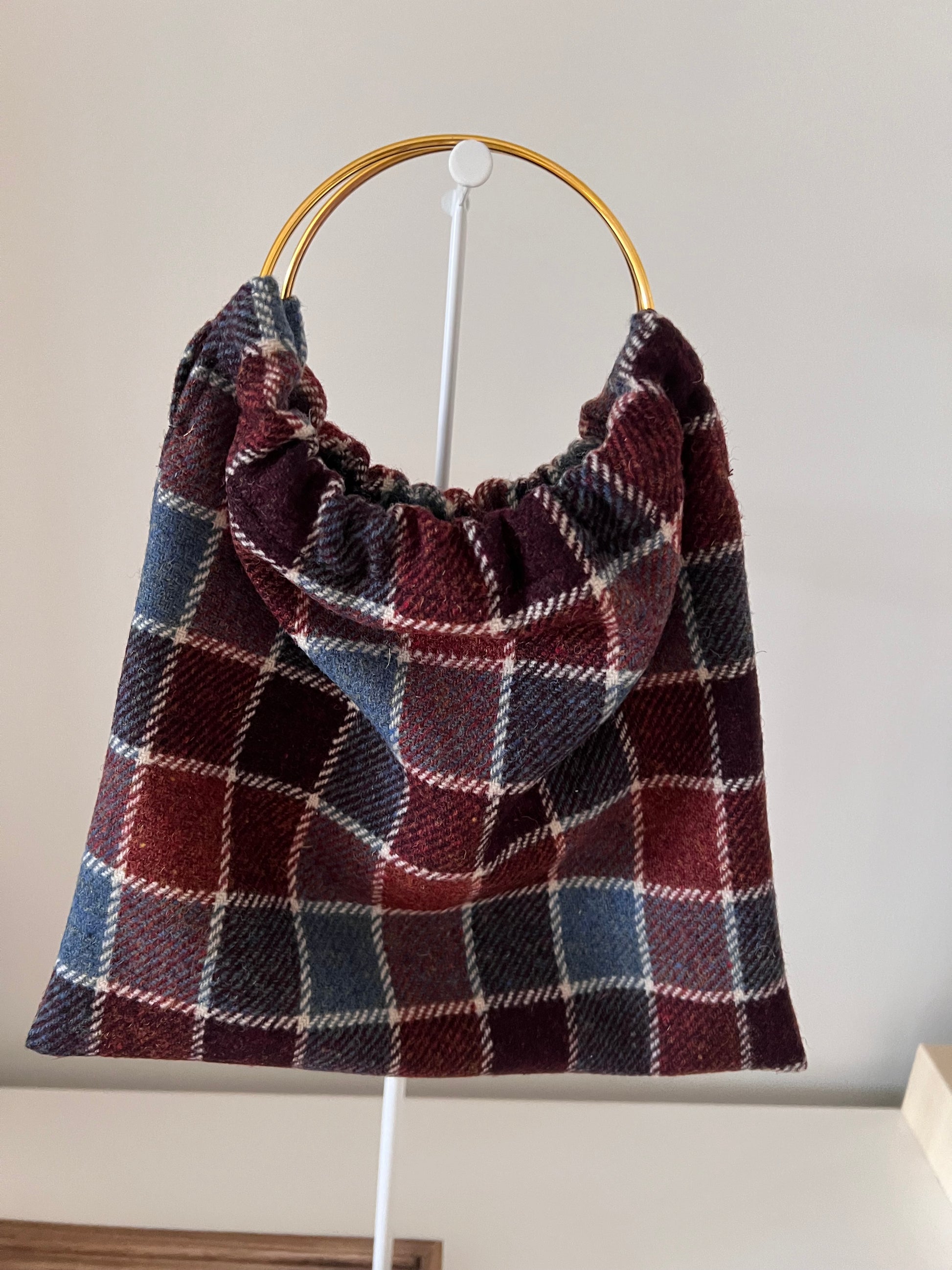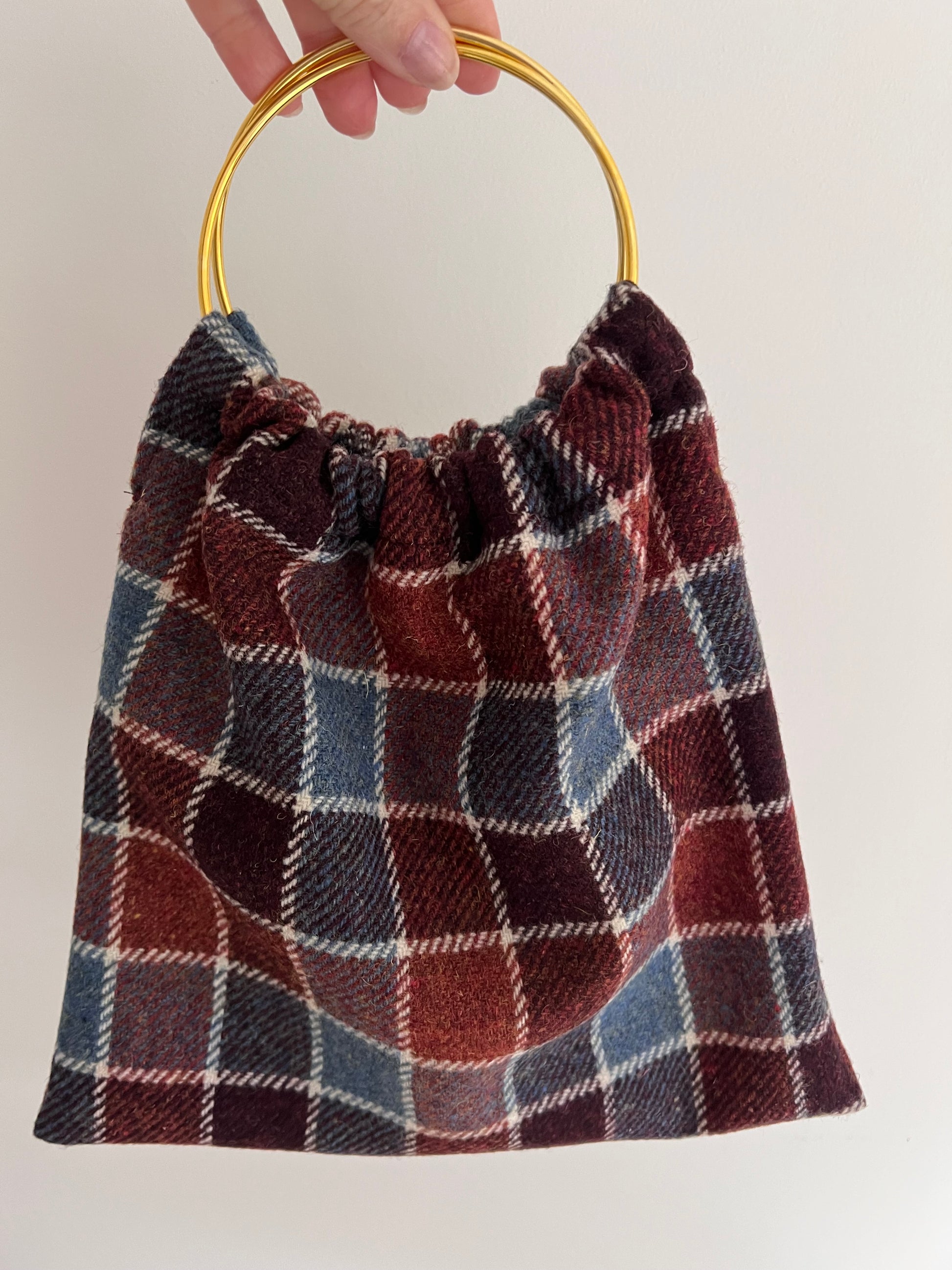 Modelo Pippa, en tejido de lana a cuadros de colores, marrón, burdeos, azul..con dos asas doradas.