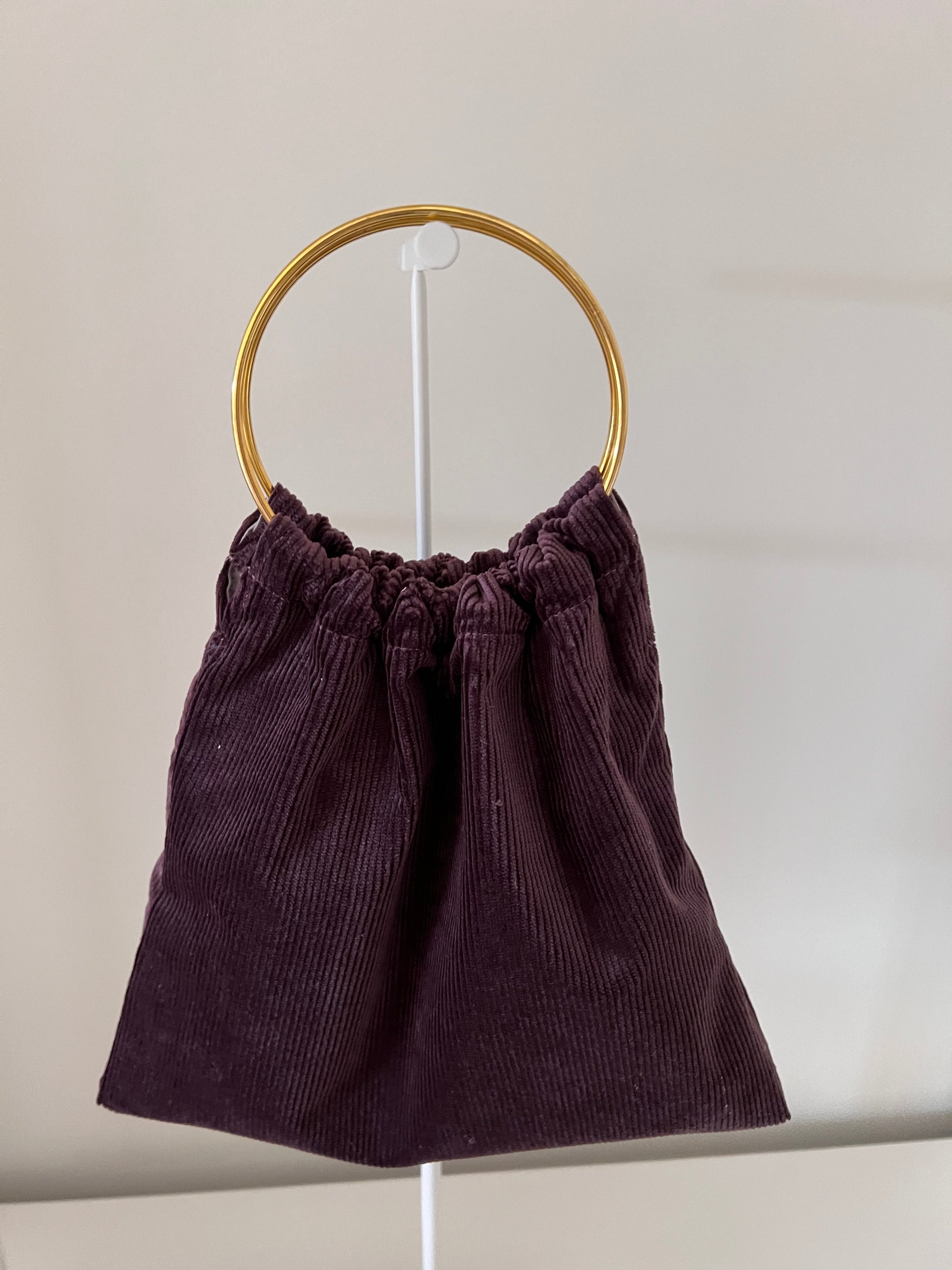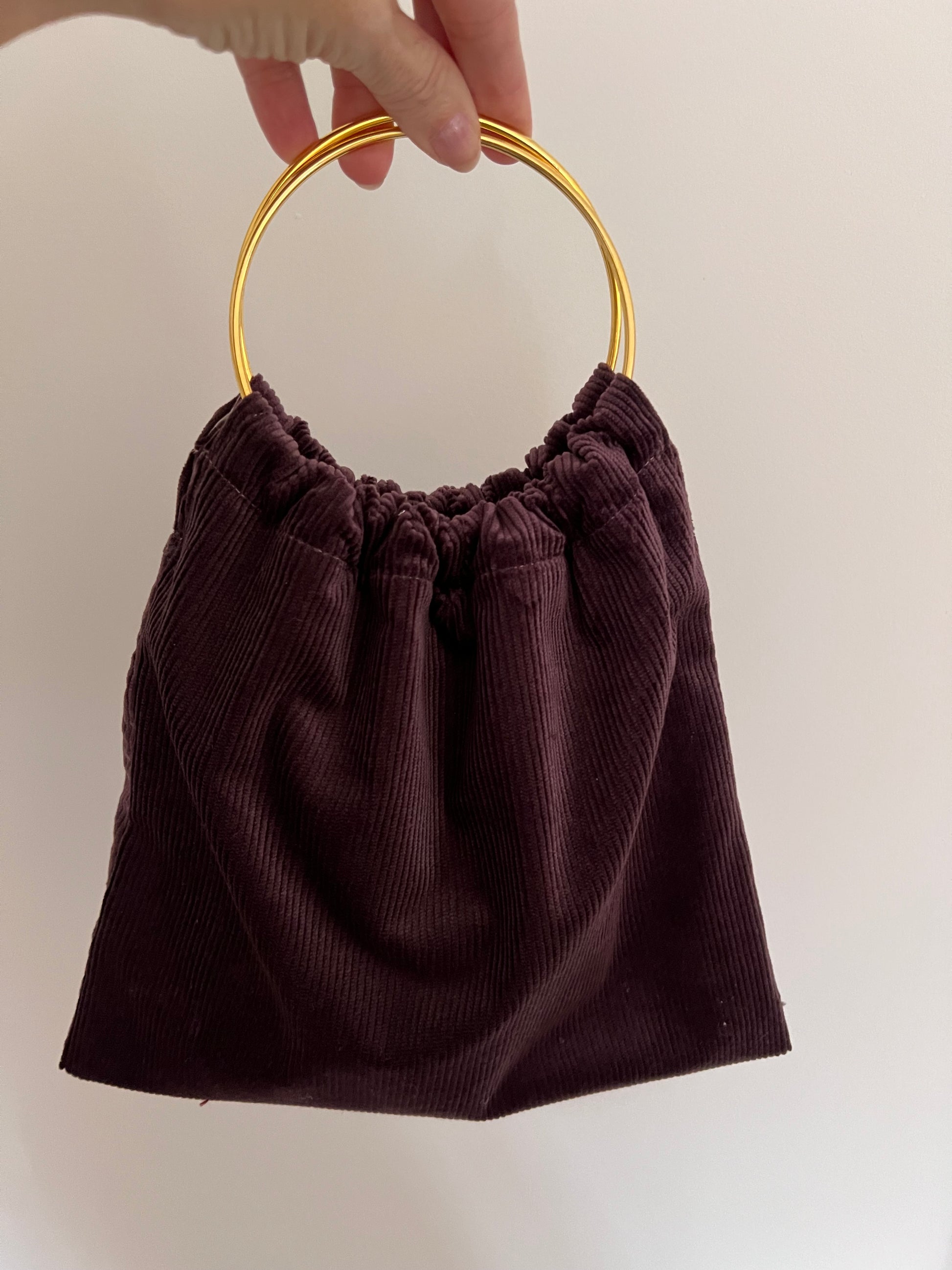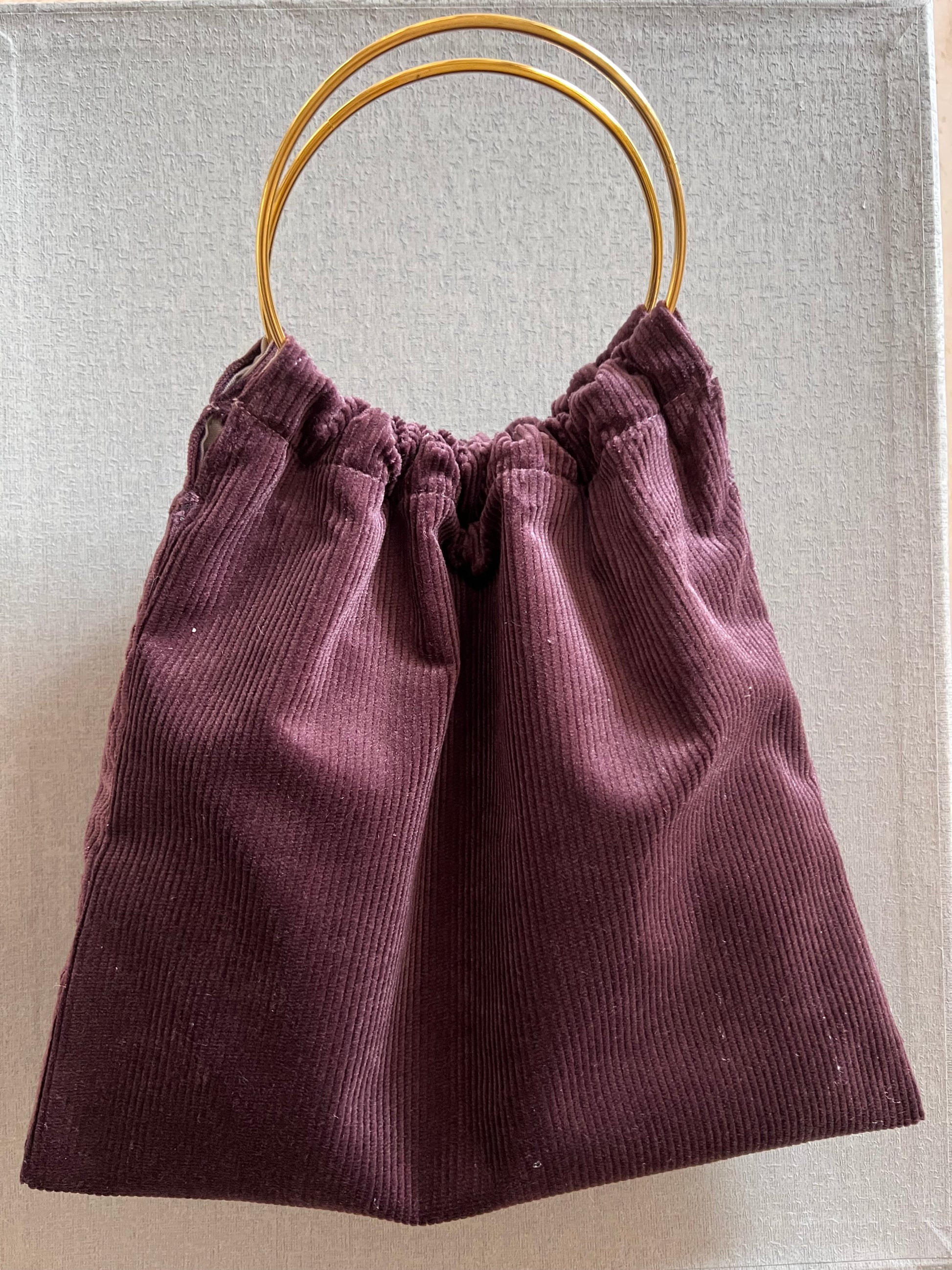 Modelo Pippa, en tejido de pana fina color Berenjena, con dos asas doradas.